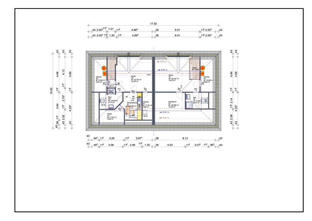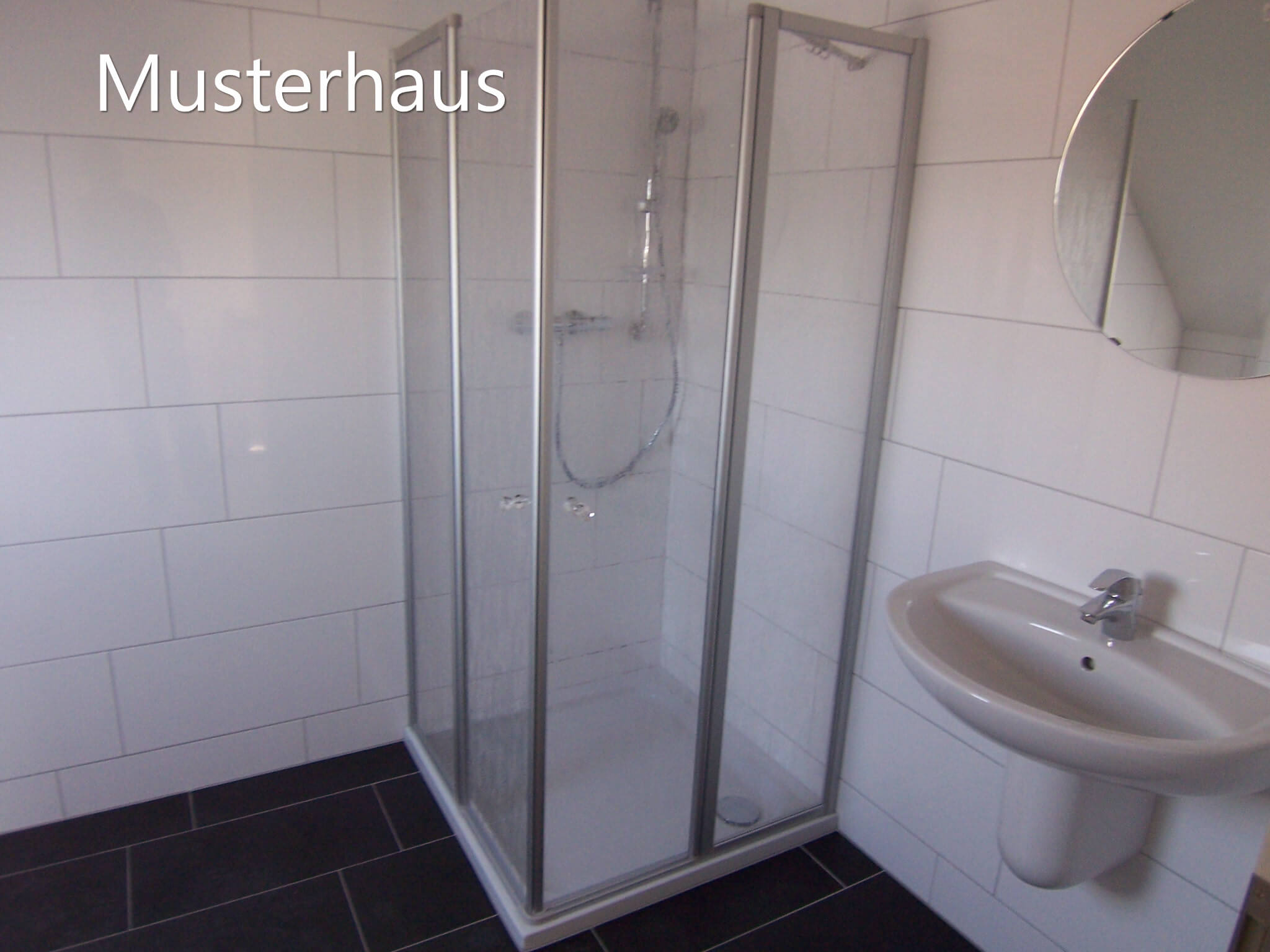 bodentiefe Dusche (1,00+1,00m, Ablage und Sitzfläche, gemauertes Seitenteil) mit hochwertiger Glastür. Hänge WC (altengerecht ca. 10cm höher), Handtuchheizkörper, Waschtisch mit Halbsäule (kleine Ablagefläche), deckenhohe und vom Erwerber selbst bestimmte Verfliesung, hochwertige Elemente und Armaturen. Das Bad im Dachgeschoss wird identisch bestückt und ausgestattet.