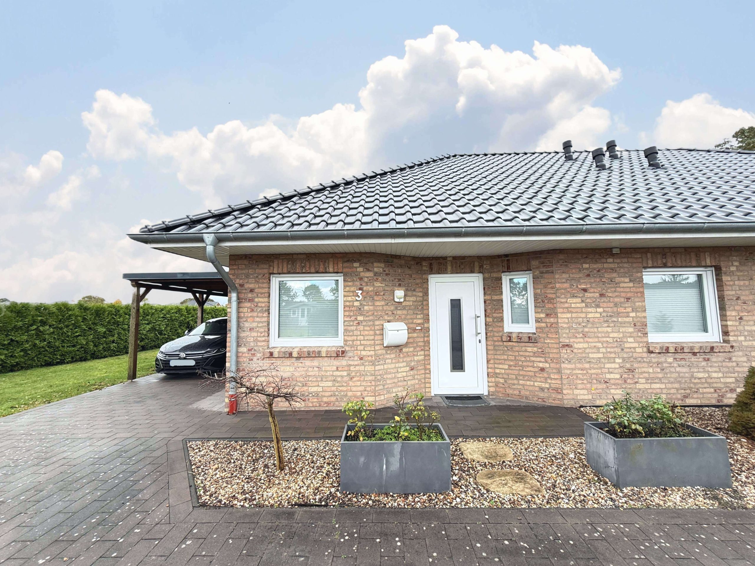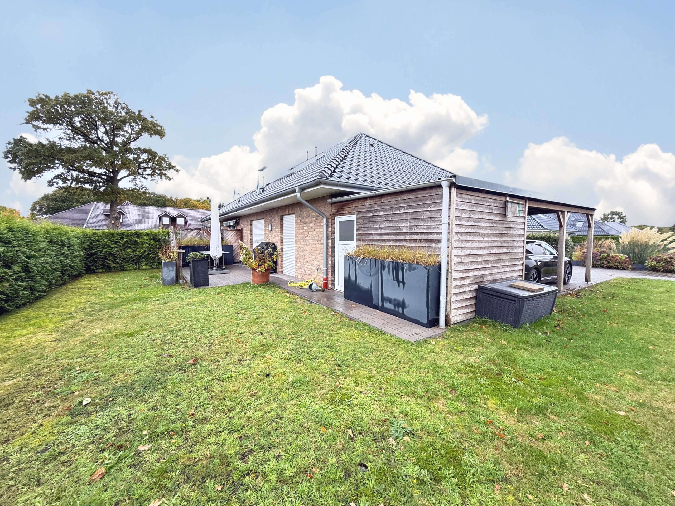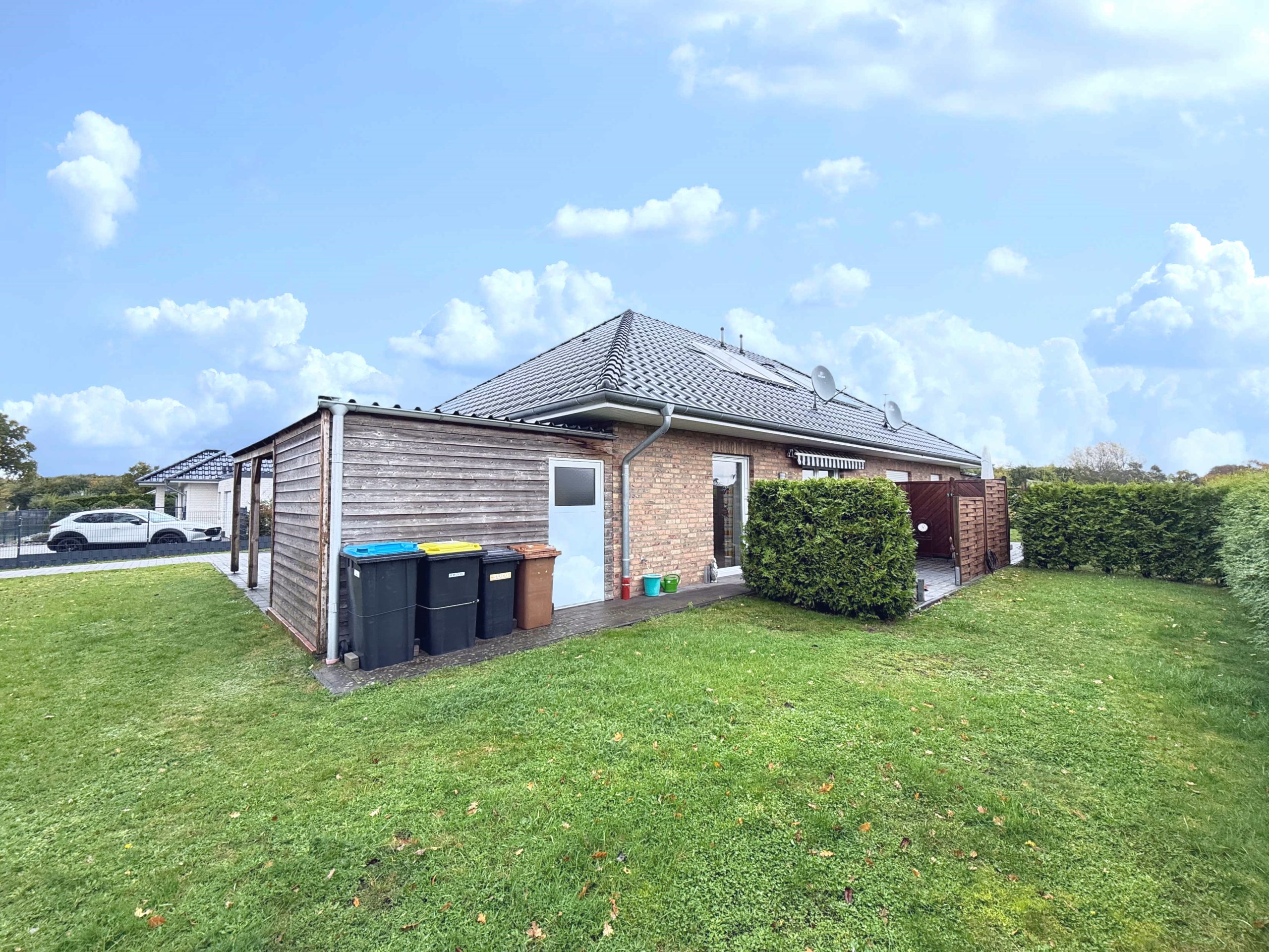 Zu jeder Haushälfte gehört ein Carport mit separatem Geräteraum, in dem Fahrräder, Gartengeräte oder Mülltonnen bequem Platz finden. Die beiden Terrassen sind voneinander getrennt und bieten dadurch maximale Privatsphäre – hier lässt sich wunderbar entspannen oder der eigene kleine Garten gestalten.