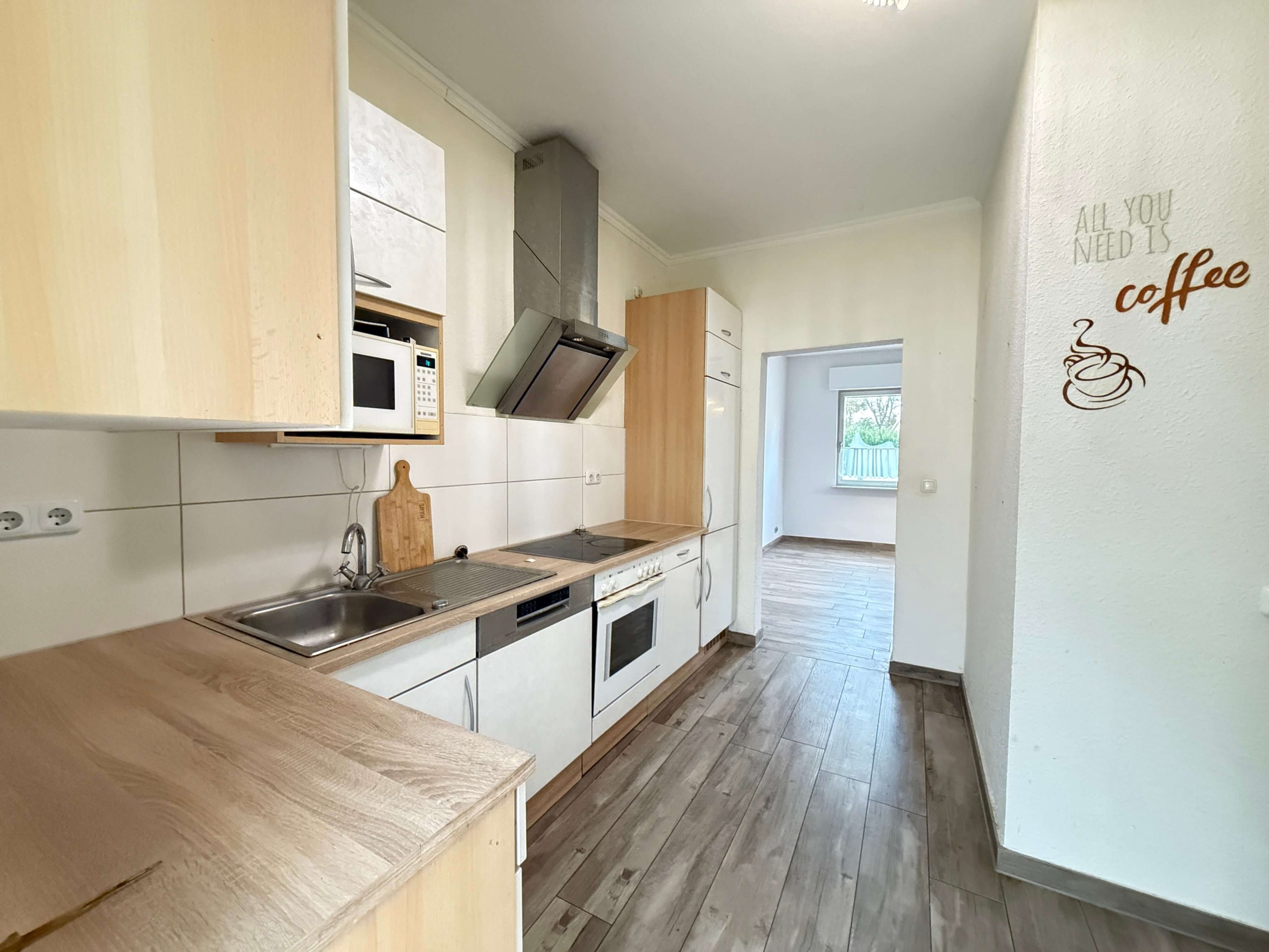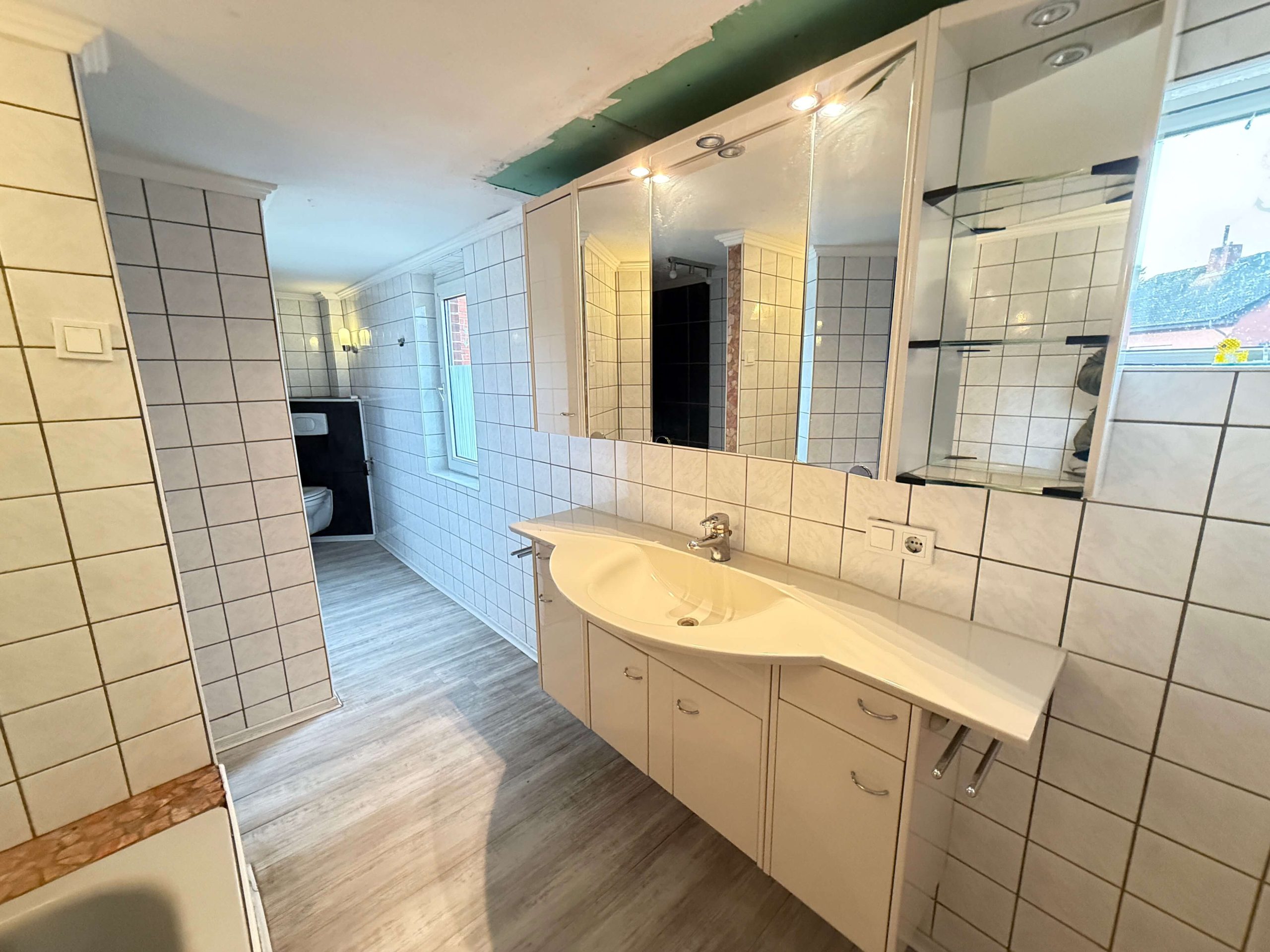 Die Einbauküche ist einfach, aber funktional – sie bietet alle wichtigen Geräte und kann mit etwas handwerklichem Geschick modernisiert oder nach eigenen Wünschen umgestaltet werden. Das Badezimmer wurde bereits zwischenzeitlich modernisiert und überzeugt durch seine helle Gestaltung, eine komfortable Badewanne sowie eine ebenerdige Dusche. Hier zeigt sich, dass klassische Bausubstanz und moderne Elemente wunderbar harmonieren können.