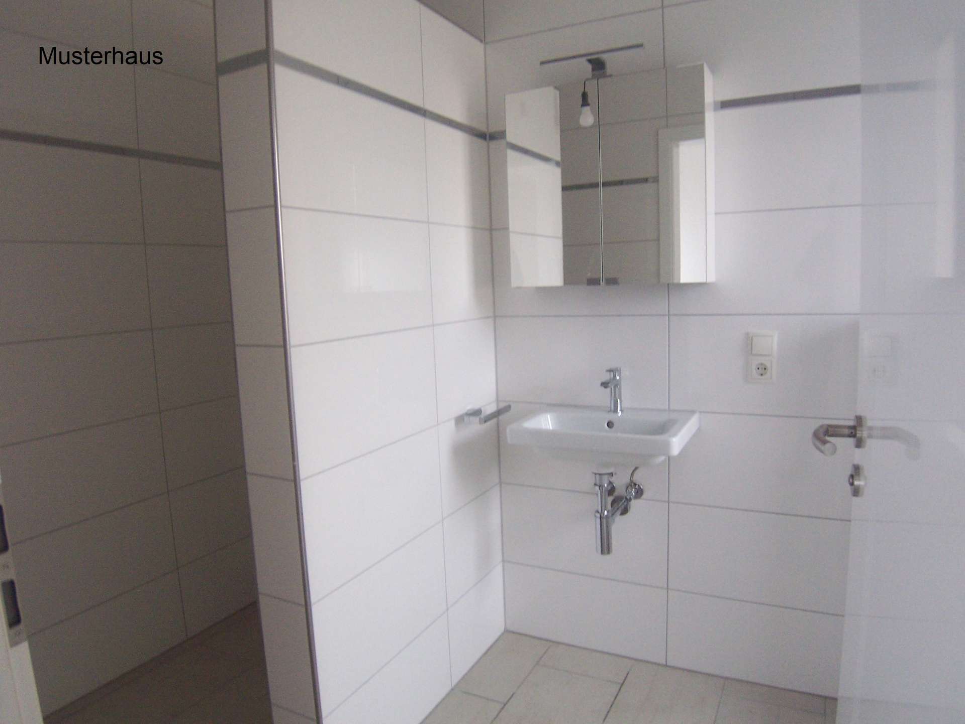 Das Duschbad im Erdgeschoss ist wie folgt ausgestattet: bodentiefe Dusche, Hänge WC, Waschbecken mit Halbsäule plus Spiegel, deckenhohe und sehr geschmackvolle Verfliesung.