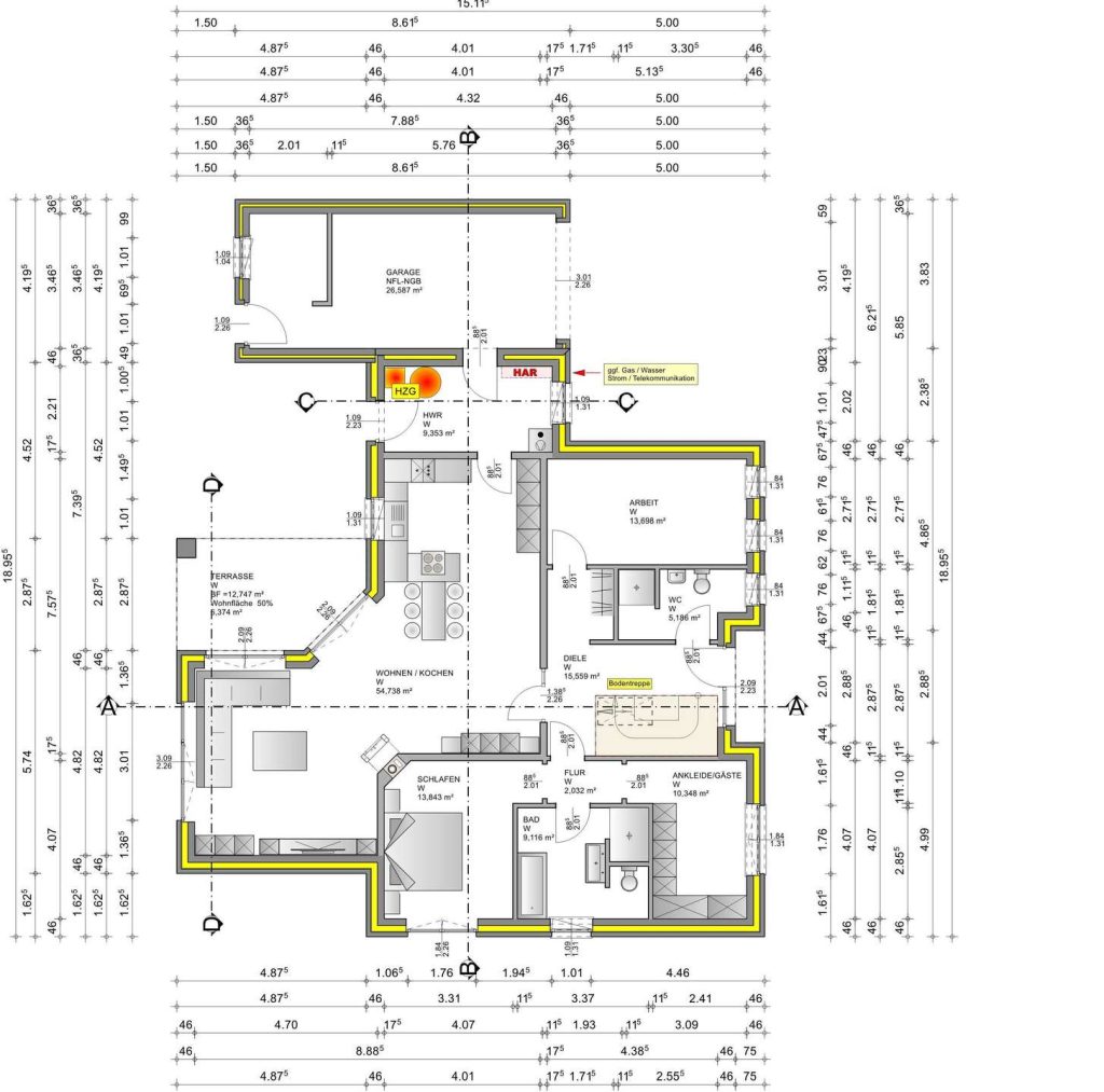 Die gesamte Grundrissgestaltung ist durchdacht und vor allem lichtdurchflutet, perfekte Anordnung der Fensterflächen bzw. Elemente. Im Dielenbereich befindet sich eine Aussparung (Treppenloch) in der Betondecke. Hier wäre der Einbau einer formschönen Treppenanlage möglich. Der gesamte Dachgeschossbereich ist ausbaufähig ca. 60 m². Bei dem Ausbau des Dachgeschoss können die Wünsche oder Vorstellungen des Erwerbers berücksichtigt werden. Das Wohn/Esszimmer verfügt über bodentiefe Fensterelemente von hier aus hat man einen traumhaften Blick auf das Gartengrundstück und betritt die großzügige und teil überdachte Gartenterrasse. Durch die intelligent angeordneten Fensterflächen geht keine Stellplatzmöglichkeit verloren. Es befinden sich 3 Schlafzimmer, ein großzügiges Bad und ein zusätzliches Dusch WC im Objekt.