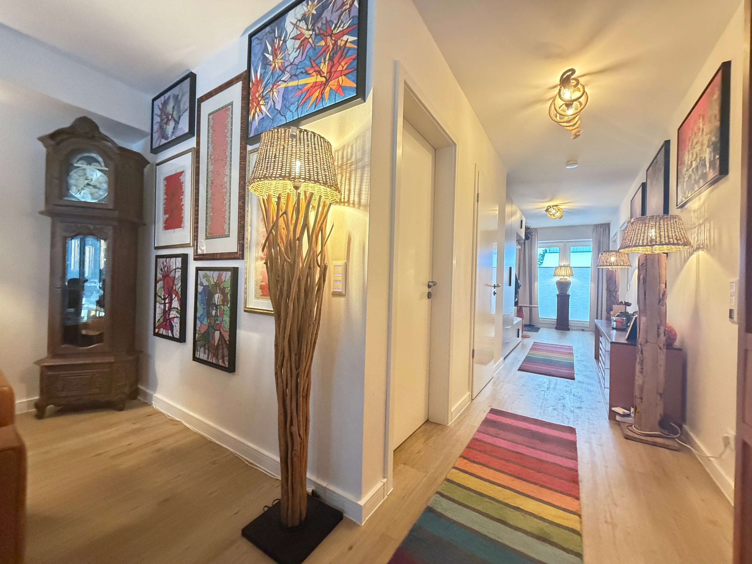 Die Wohnung ist mit einer Fußbodenheizung in allen Räumen ausgestattet, die über eine digitale Heizungssteuerung geregelt wird. Jeder Raum ist über ein eigenes Bedienfeld steuerbar. Zusätzlich sorgt eine kontrollierte Be- und Entlüftung für ein angenehmes Raumklima. Eine Gegensprechanlage mit Kamera, Glasfaseranschluss sowie ein funktionaler Hauswirtschaftsraum mit maßgefertigten Einbauschränken unterstreichen den hohen Ausstattungsstandard. Die bodentiefen Fenster sowie die großzügige Hebeschiebetür zum Sommergarten sind nahezu vollständig mit Fliegengittern versehen und verbinden Wohnkomfort, Frischluftzufuhr und Funktionalität auf angenehme Weise. Für weiteren Sichtschutz sorgen die teilweise angebrachten Plissees an den bodentiefen Fenstern.