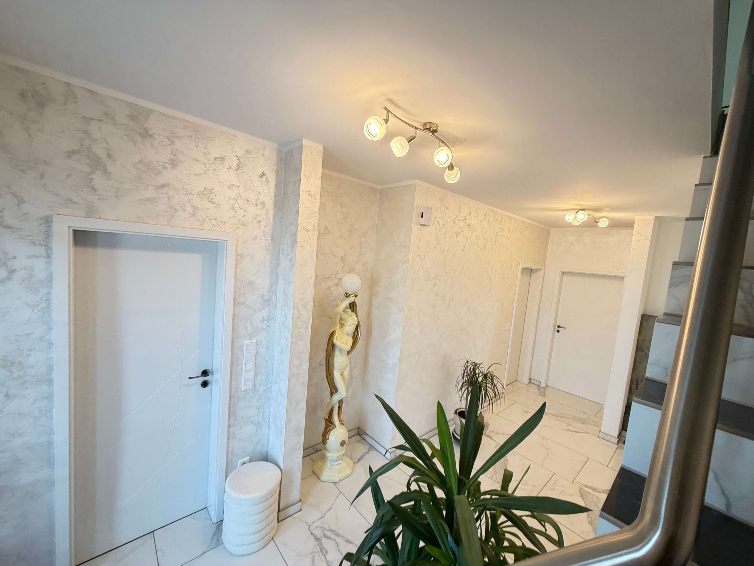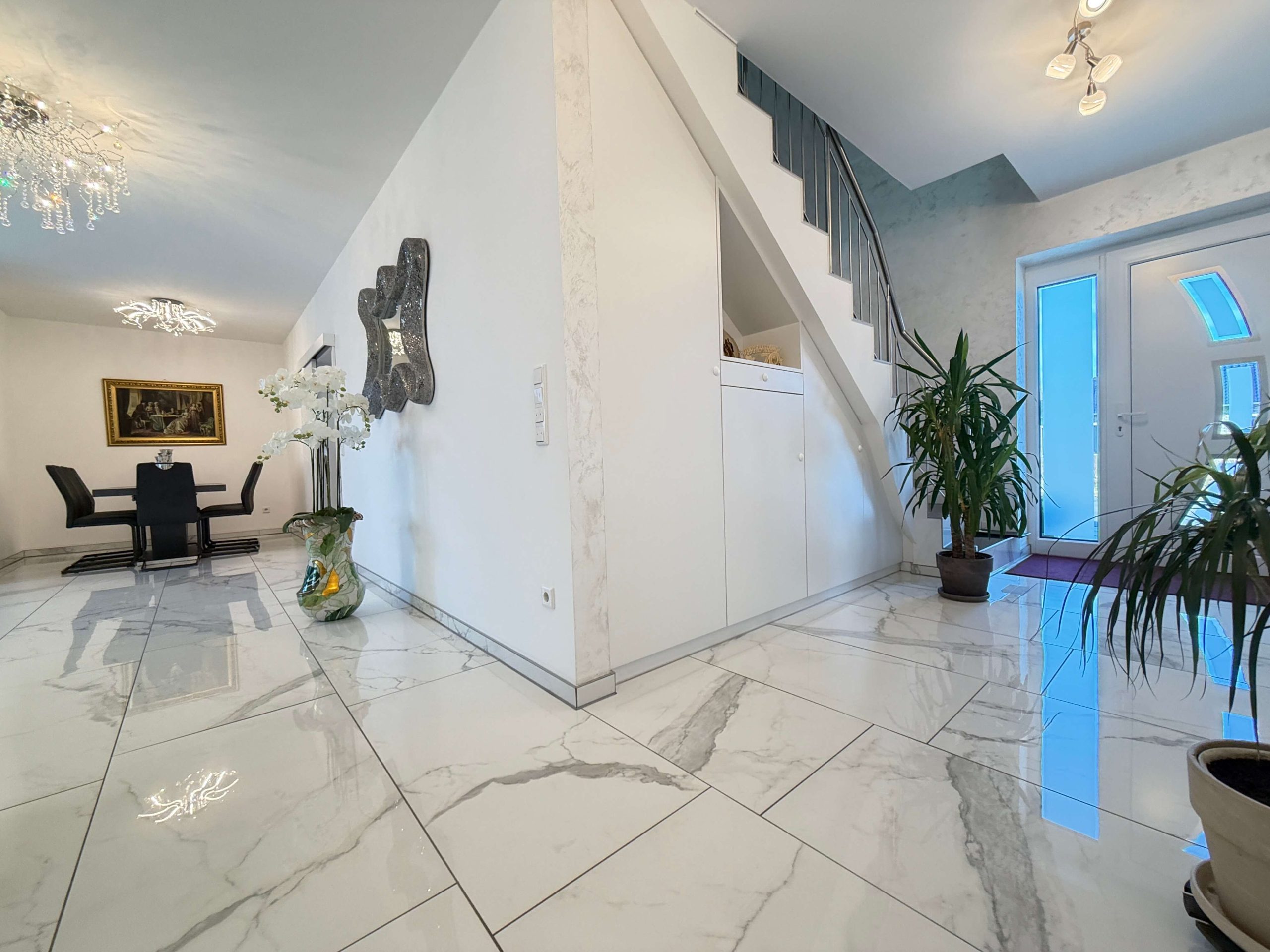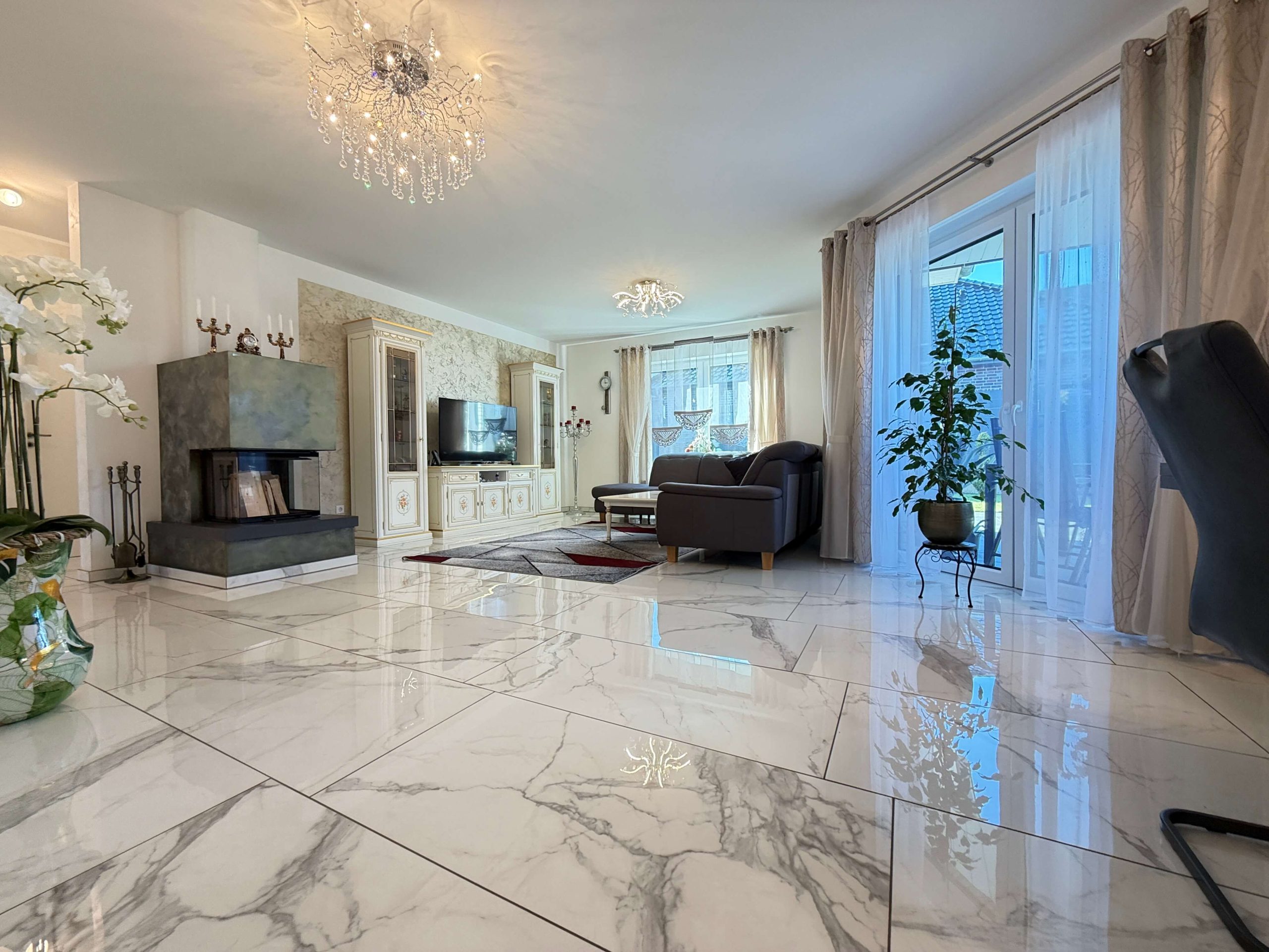 Bereits beim Betreten des Hauses wird der Anspruch an Qualität und Design deutlich. Großflächige Bodenfliesen in eleganter Marmoroptik prägen die Wohnbereiche sowie die Badezimmer und verleihen den Räumen eine stilvolle, zeitlose Ausstrahlung. In den Schlafzimmern wurde hochwertiges Laminat verlegt, das eine warme, wohnliche Atmosphäre schafft. Stilvolle weiße Innentüren unterstreichen das klare, moderne Gestaltungskonzept.