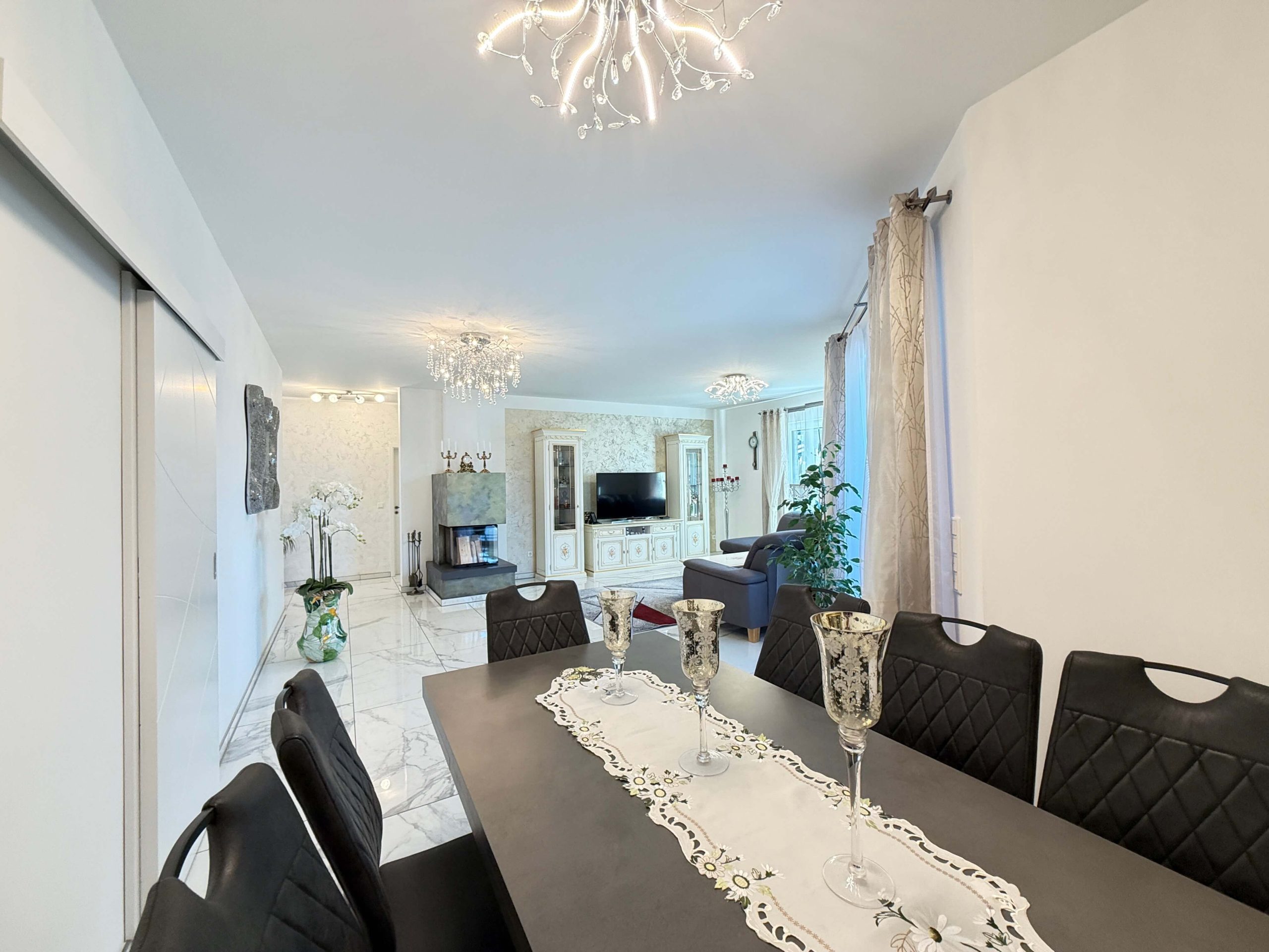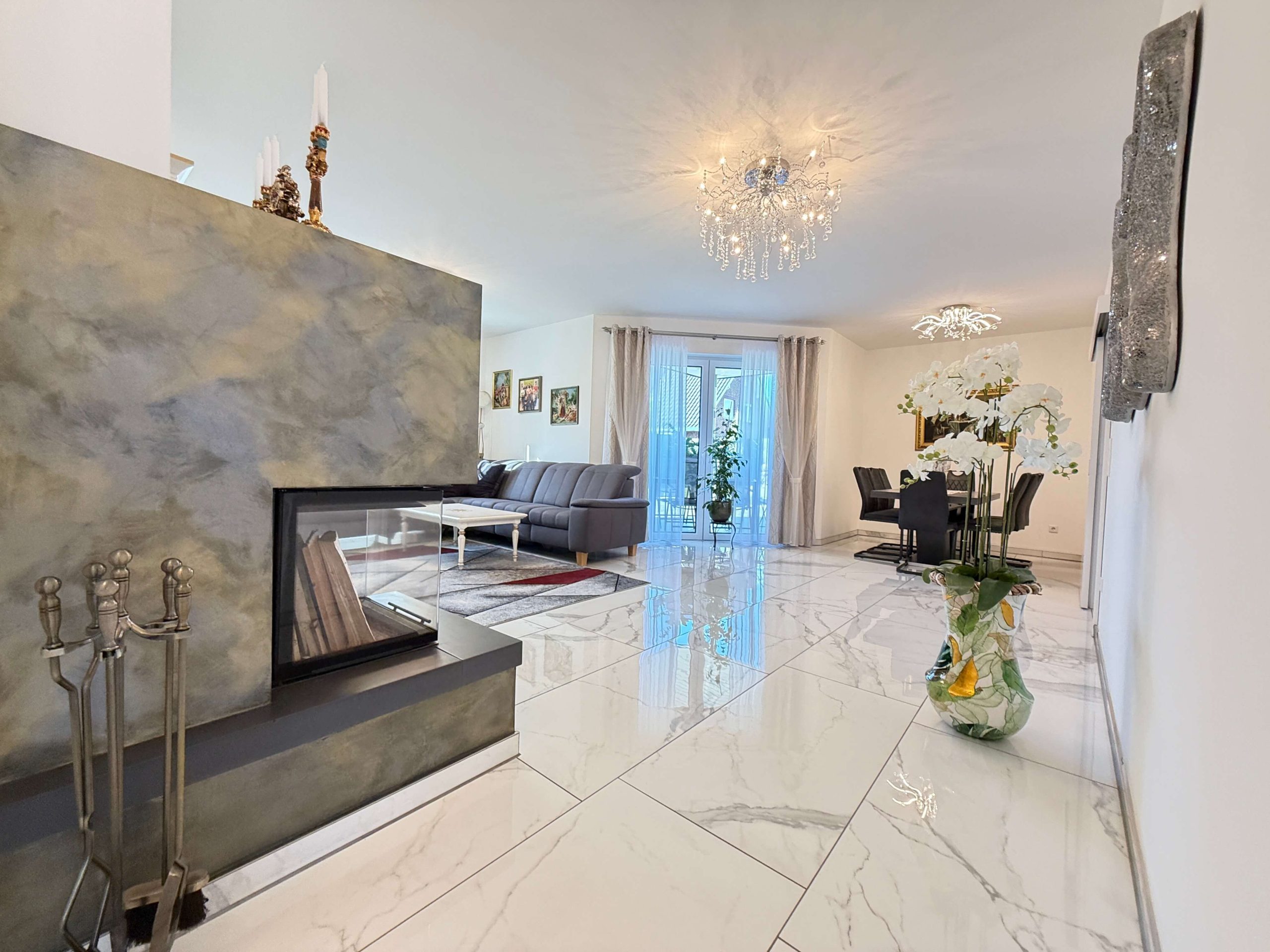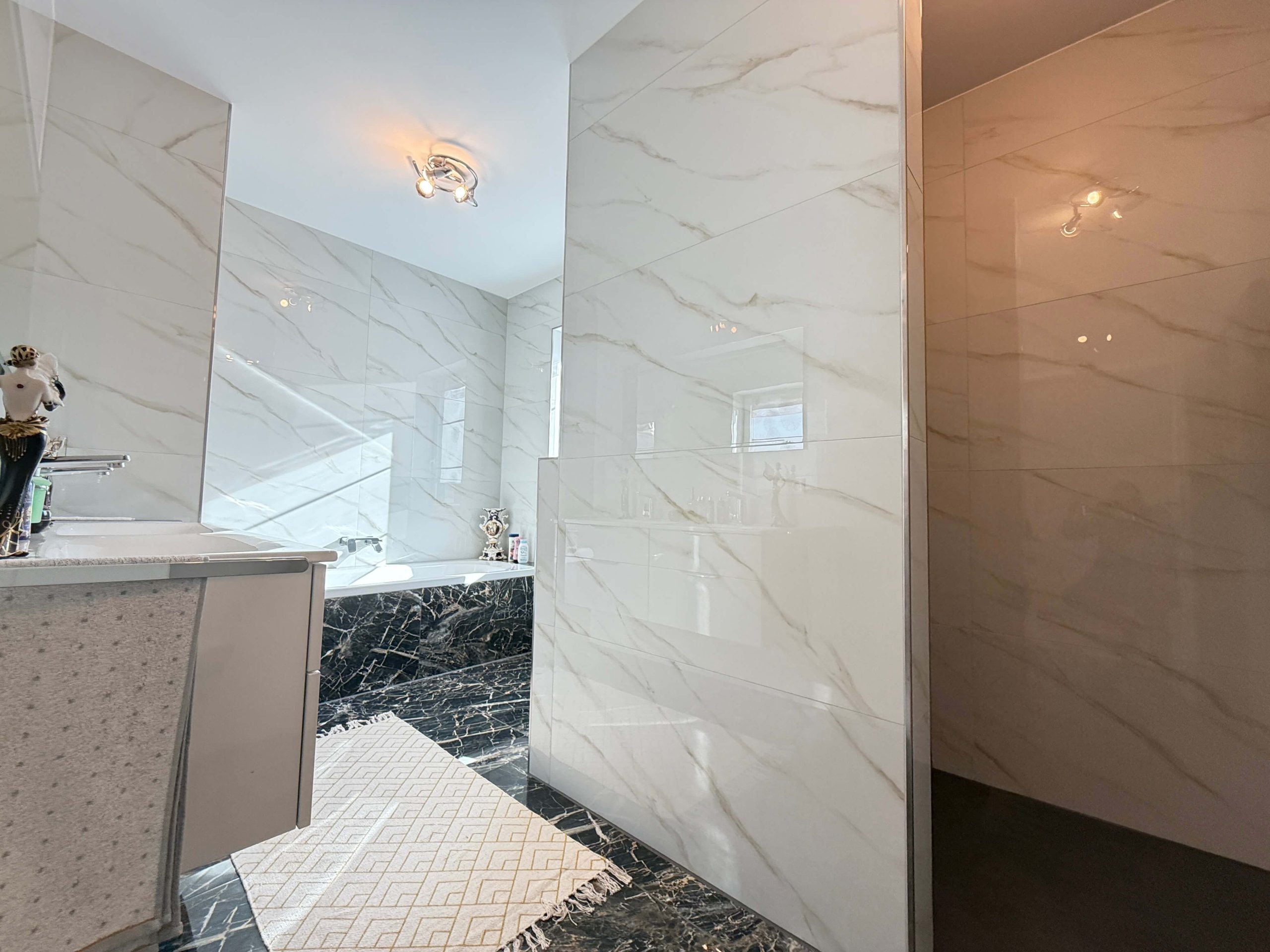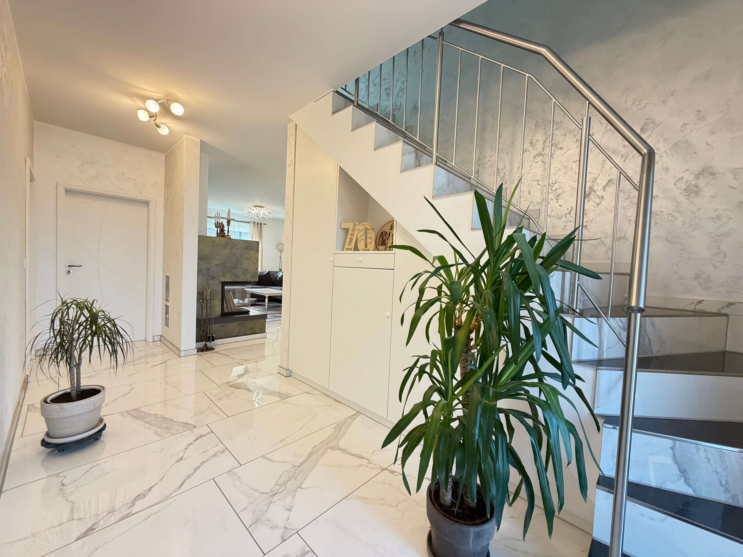 Bereits beim Betreten des Hauses wird der Anspruch an Qualität und Design deutlich. Großflächige Bodenfliesen in eleganter Marmoroptik prägen die Wohnbereiche sowie die Badezimmer und verleihen den Räumen eine stilvolle, zeitlose Ausstrahlung. In den Schlafzimmern wurde hochwertiges Laminat verlegt, das eine warme, wohnliche Atmosphäre schafft. Stilvolle weiße Innentüren unterstreichen das klare, moderne Gestaltungskonzept.
