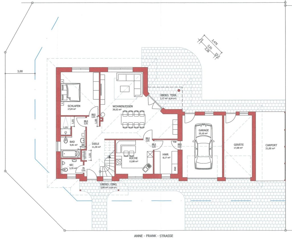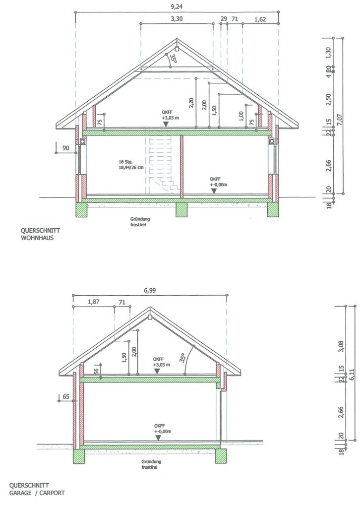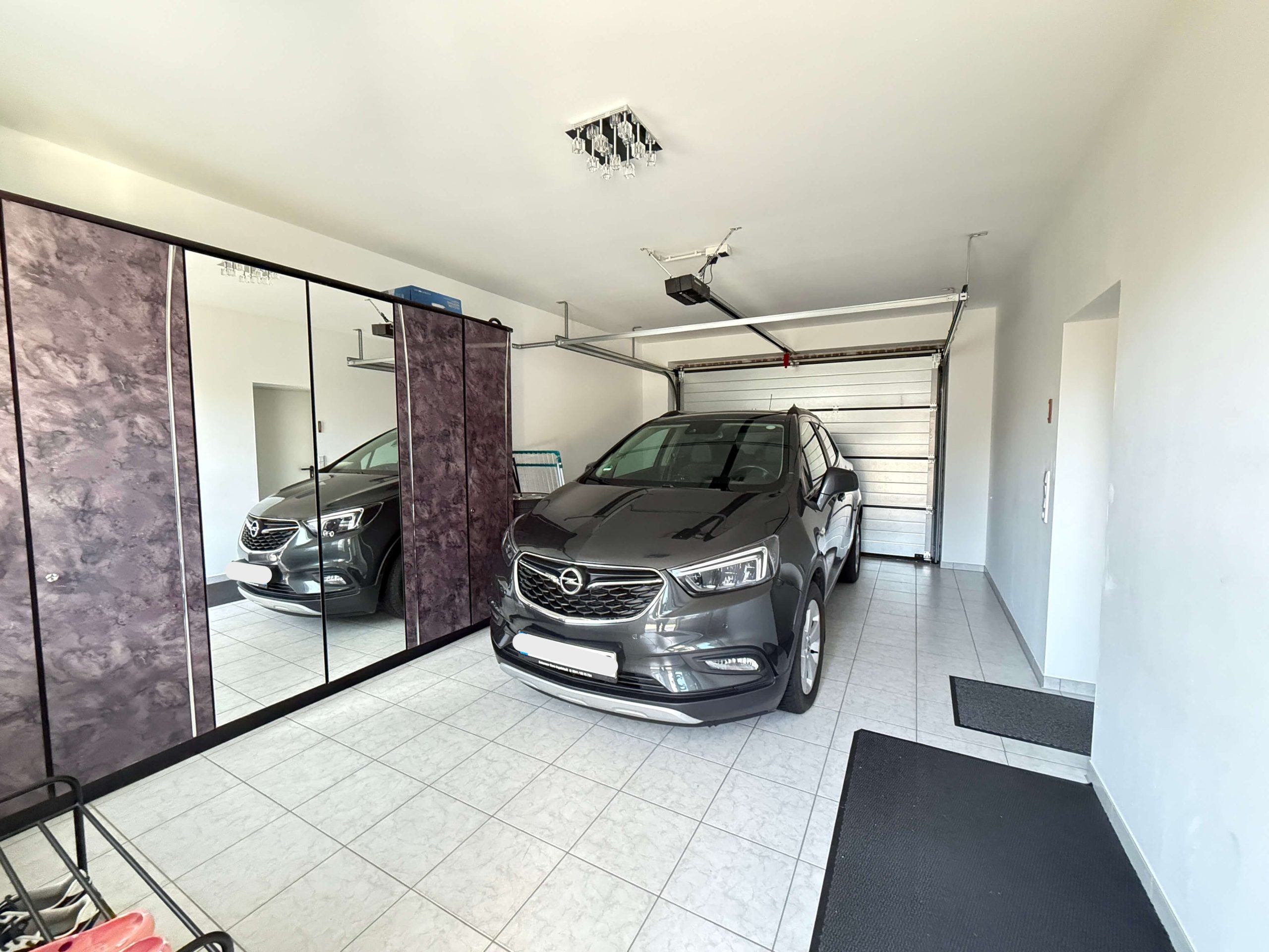 Die geflieste Doppelgarage ist harmonisch unter das Walmdach integriert und bietet direkten Schutz für Ihre Fahrzeuge. Neben der Garage besteht die Möglichkeit für einen Wohnmobilstellplatz oder die Errichtung eines bereits genehmigten Carports – ideal für zusätzliche Mobilität.