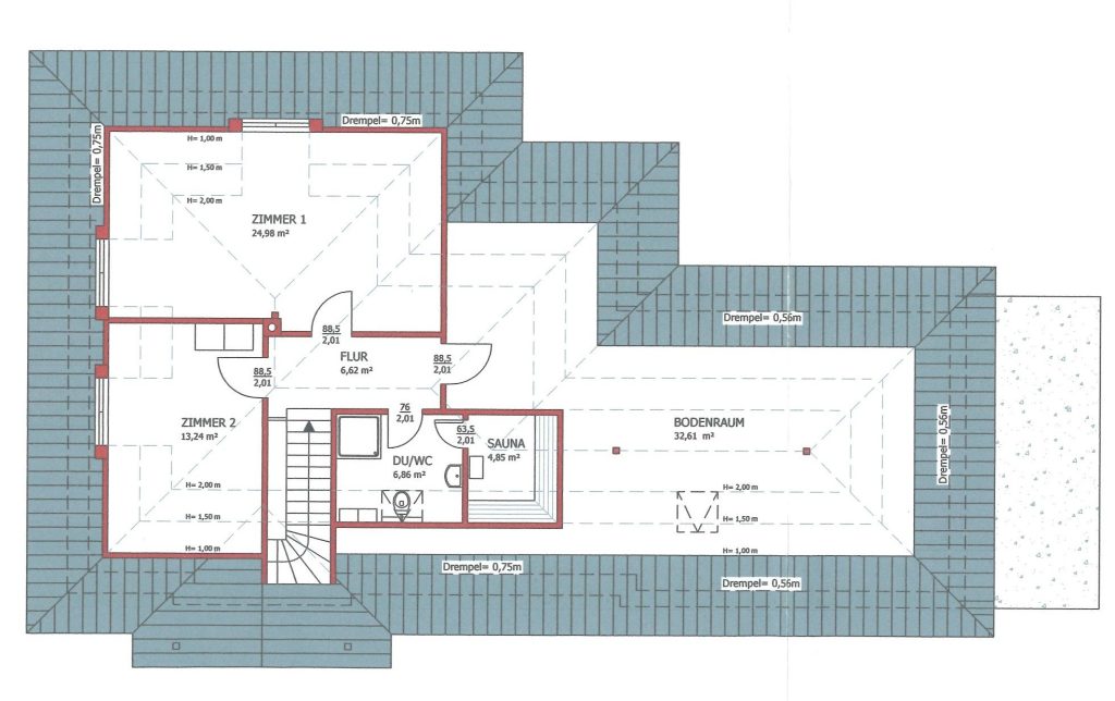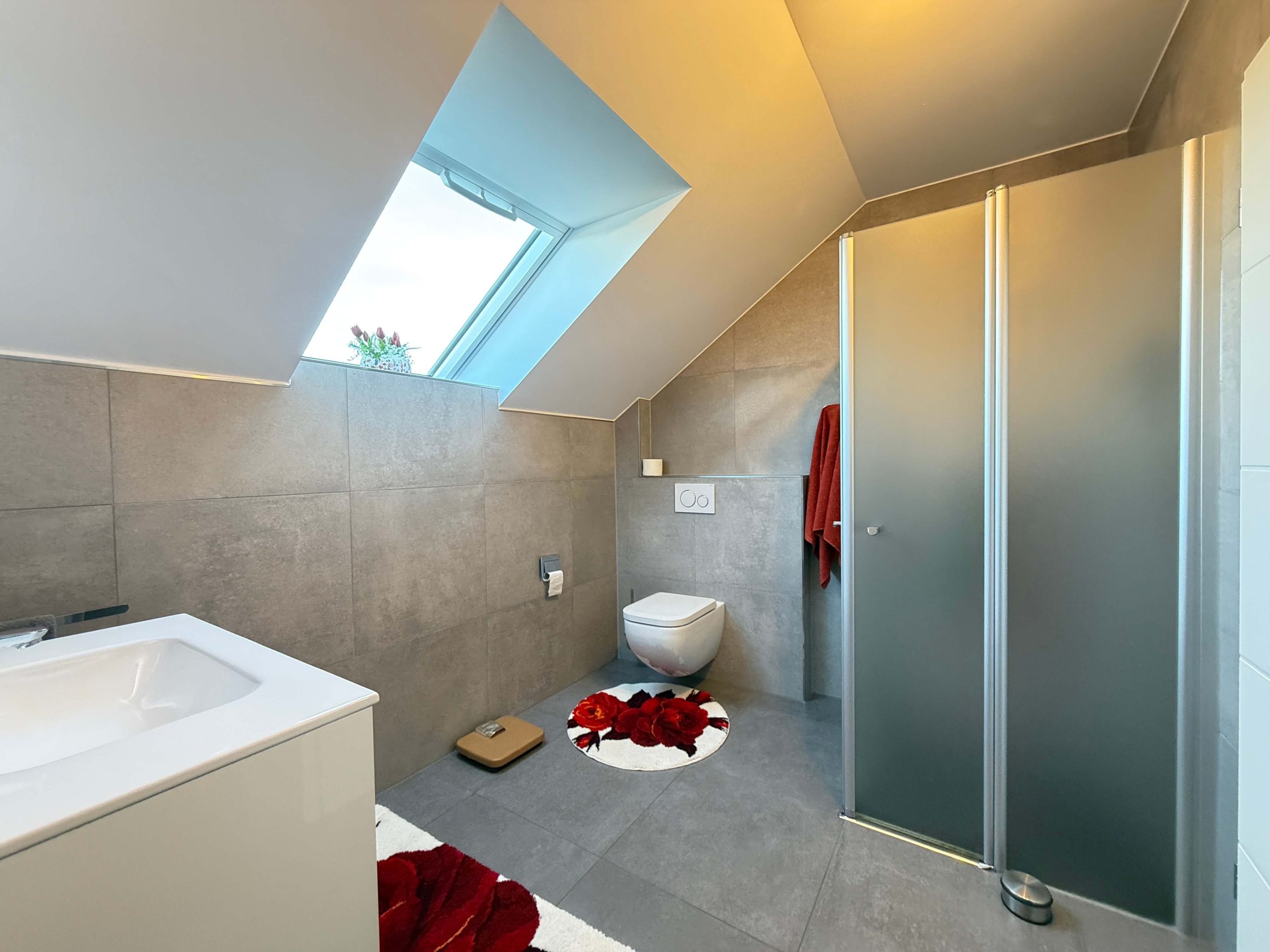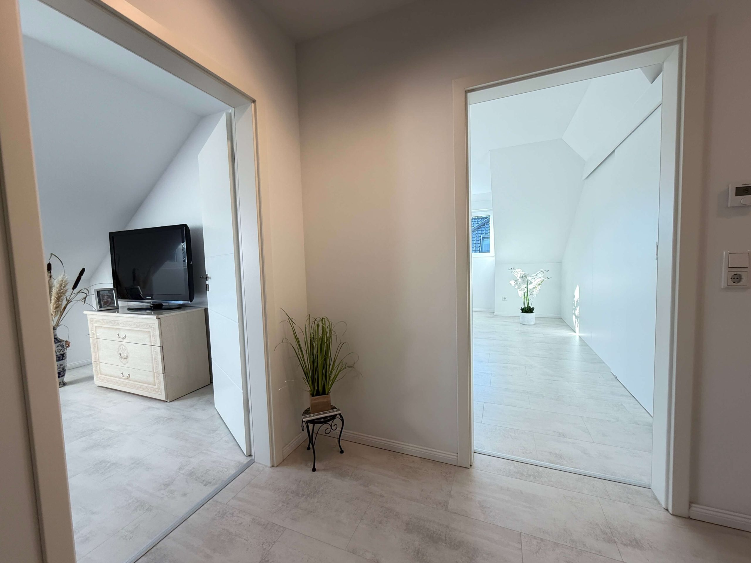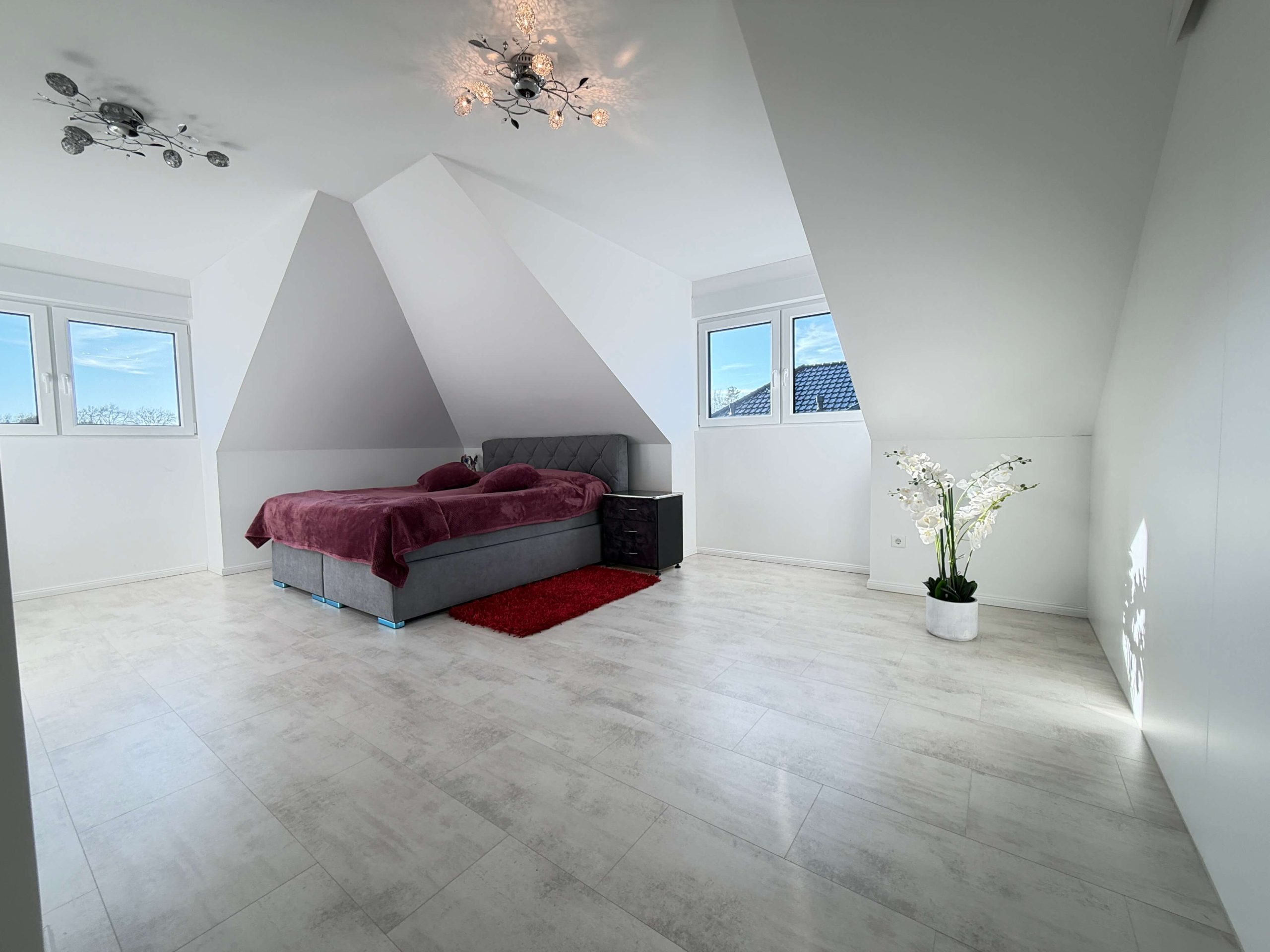 Das Dachgeschoss erweitert das Raumangebot um zwei weitere Schlafzimmer, von denen eines mit maßgefertigten Einbauschränken ausgestattet ist. Zusätzlich steht ein vorbereitetes Studiozimmer zur Verfügung – die Fußbodenheizung ist hier bereits installiert. Ob Homeoffice, Hobbyraum oder weiteres Schlafzimmer – dieser Bereich bietet maximale Flexibilität. Ein weiteres Highlight ist das Duschbadezimmer im Dachgeschoss mit integrierter Sauna, das privaten Wellnesskomfort auf höchstem Niveau bietet.