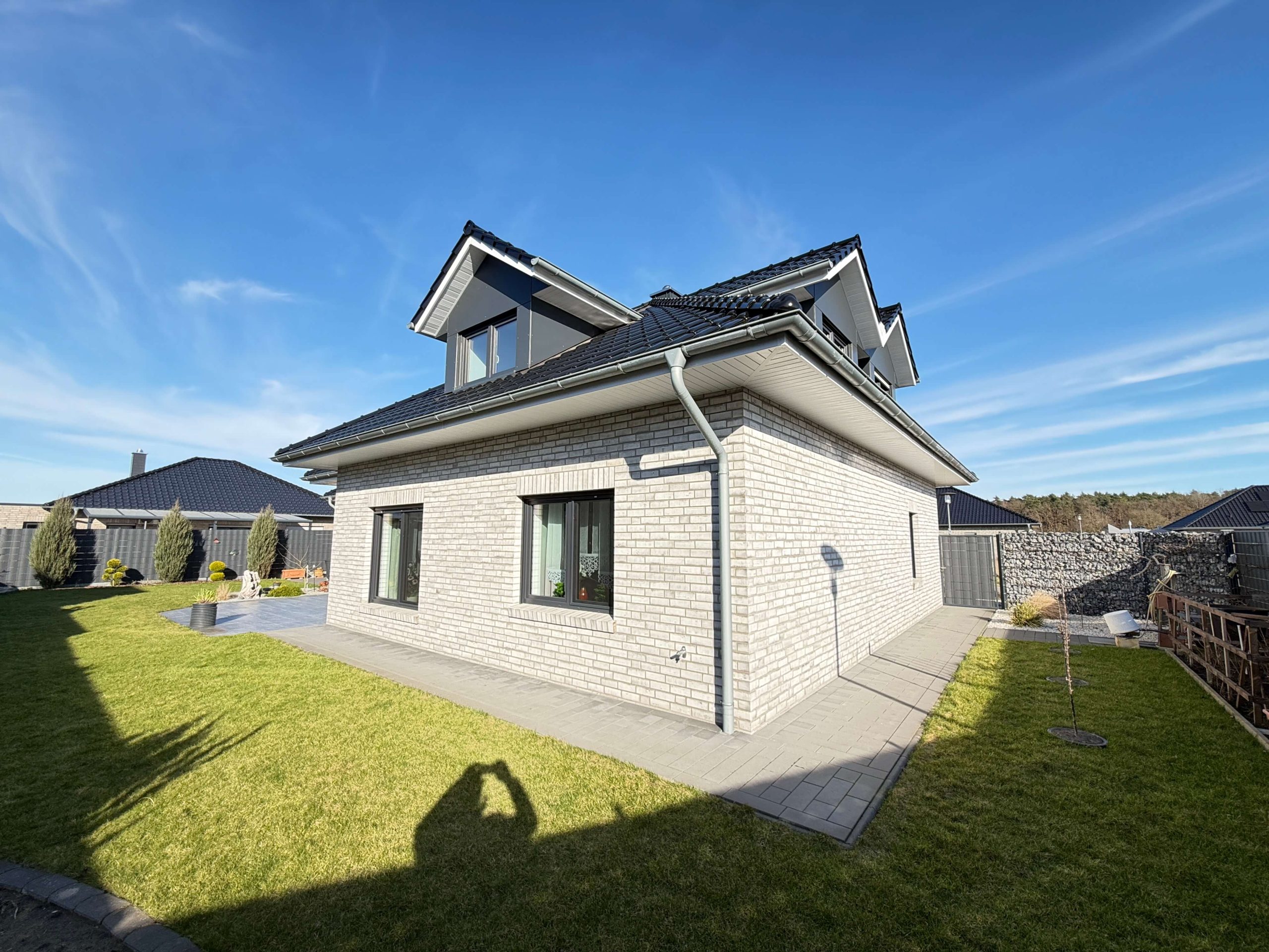 Der Außenbereich ist ebenso hochwertig gestaltet wie das Innere des Hauses. Die teilüberdachte Terrasse lädt zu entspannten Stunden im Freien ein und öffnet sich zu einem liebevoll angelegten Garten. Das Grundstück ist vollständig eingefriedet, teilweise mit modernen Steingabionen – ein Höchstmaß an Privatsphäre und Sicherheit inklusive.