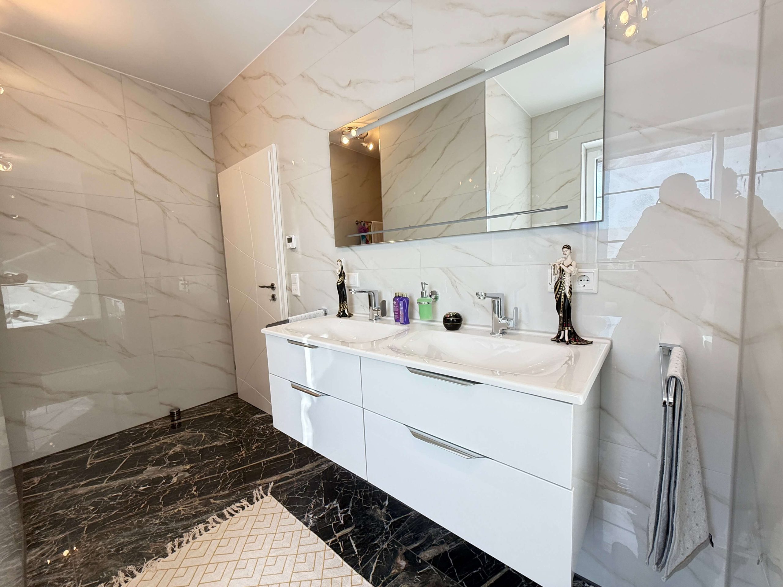 Im Erdgeschoss befindet sich neben einem großzügigen Schlafzimmer ein exklusiv ausgestattetes Badezimmer. Dieses bietet eine ebenerdige Dusche, eine Badewanne, Doppelwaschtisch mit beleuchtetem Spiegel sowie ein wandhängendes WC – eine elegante Wellnessoase im eigenen Zuhause.