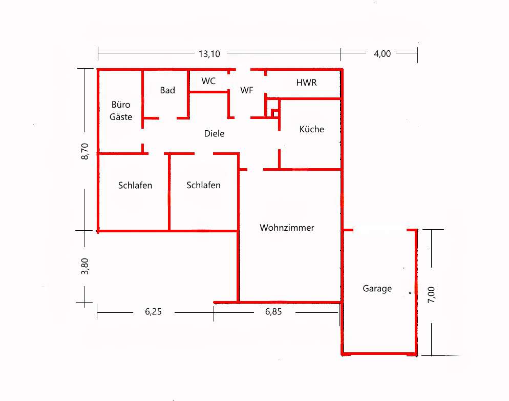 Der Bungalow verfügt über drei Schlafzimmer, die flexibel als Schlaf-, Gäste- oder Arbeitszimmer genutzt werden können. Das Badezimmer ist mit einer Dusche sowie einer Badewanne ausgestattet und bietet damit Komfort für unterschiedliche Bedürfnisse. Die Bodenbeläge bestehen aus Teppich, Laminat und Fliesen und unterstreichen den soliden Charakter des Hauses. Die Decke ist als klassische Holzbalkenlage ausgeführt und verleiht den Räumen eine warme, wohnliche Atmosphäre.