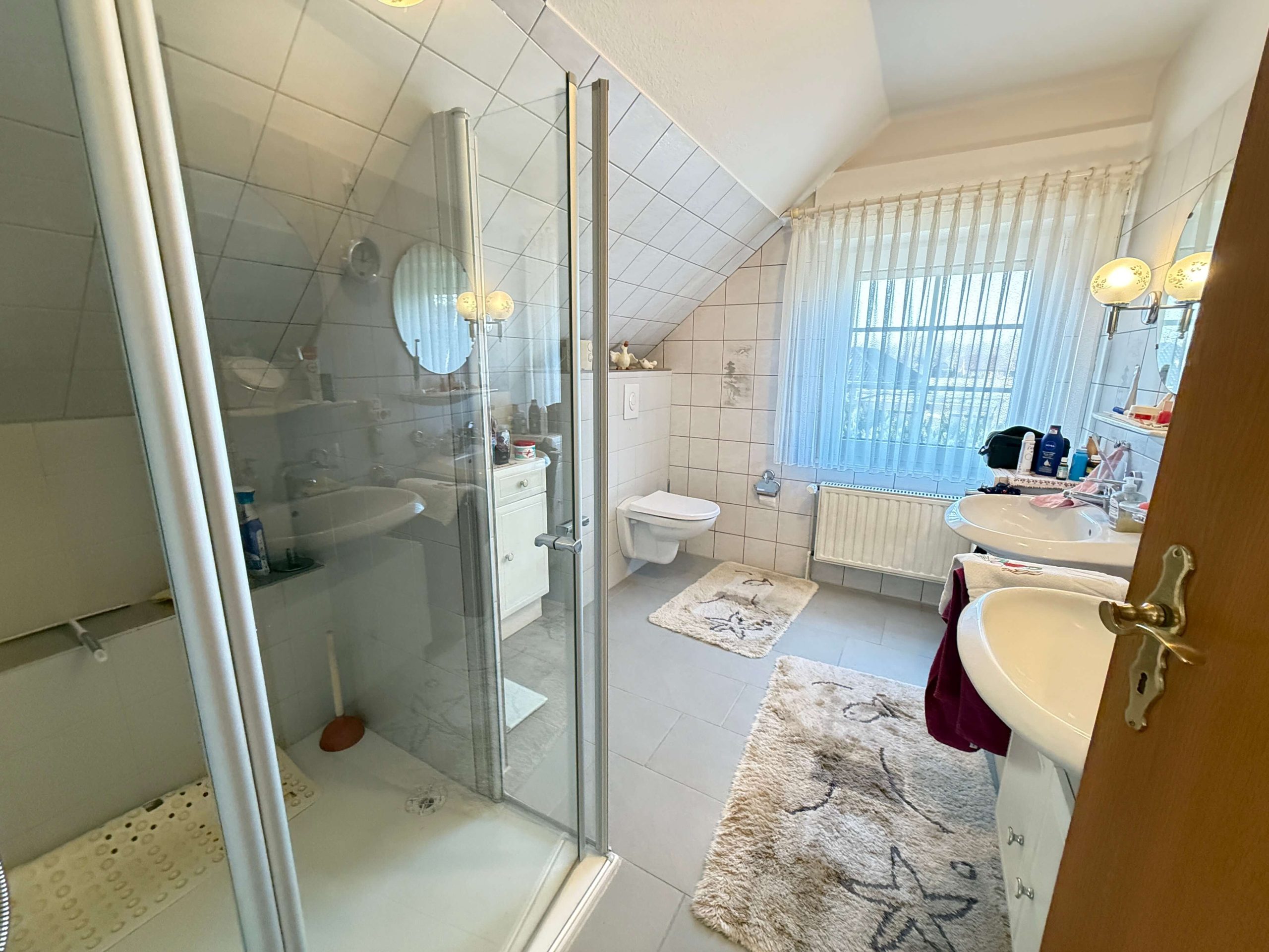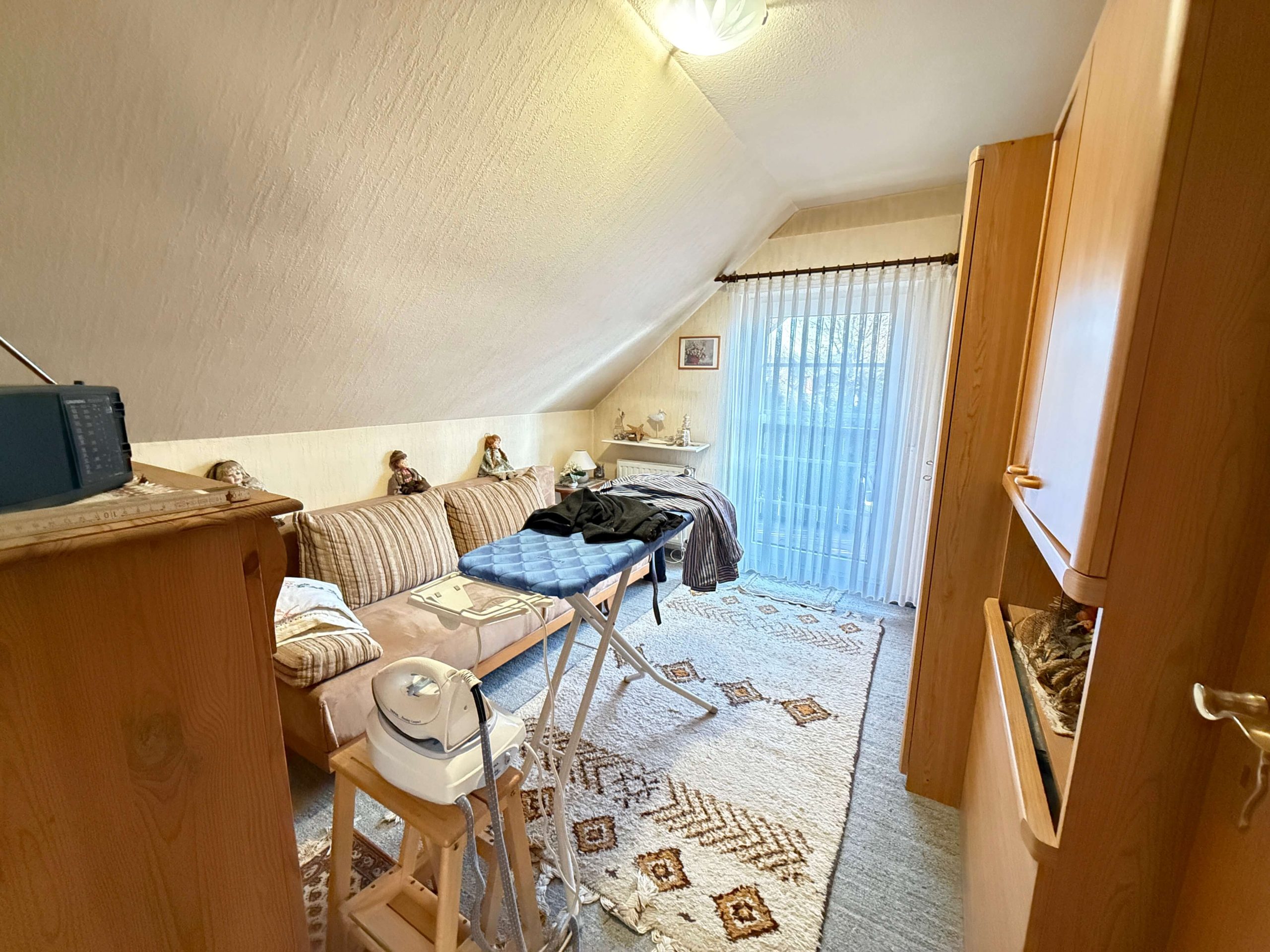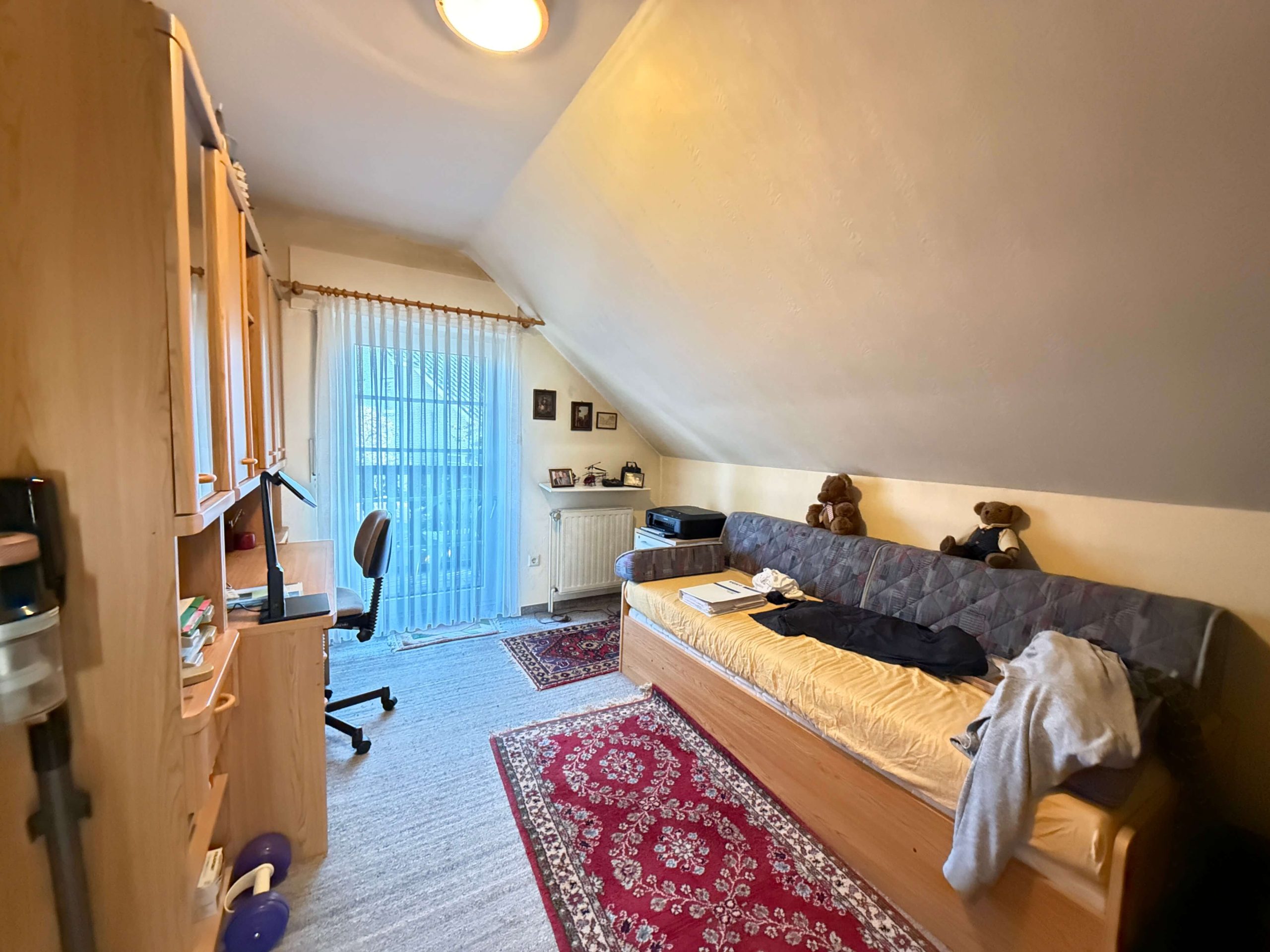 Im Obergeschoss stehen drei Schlafzimmer zur Verfügung, die flexibel als Elternschlafzimmer, Kinderzimmer, Gästezimmer oder Homeoffice genutzt werden können. Zwei der Schlafzimmer verfügen über einen direkten Zugang zum Balkon, von dem aus sich ein schöner Blick in die ruhige Nachbarschaft bietet. Das Badezimmer im Obergeschoss ist mit einer Dusche ausgestattet und gefliest. In den übrigen Räumen des Obergeschosses sorgen Teppichböden für eine angenehme Wohnlichkeit. Das Haus ist mit Sprossen-Kunststofffenstern mit Zweifachverglasung sowie Rollläden ausgestattet, die zu einem guten Wohnklima beitragen.