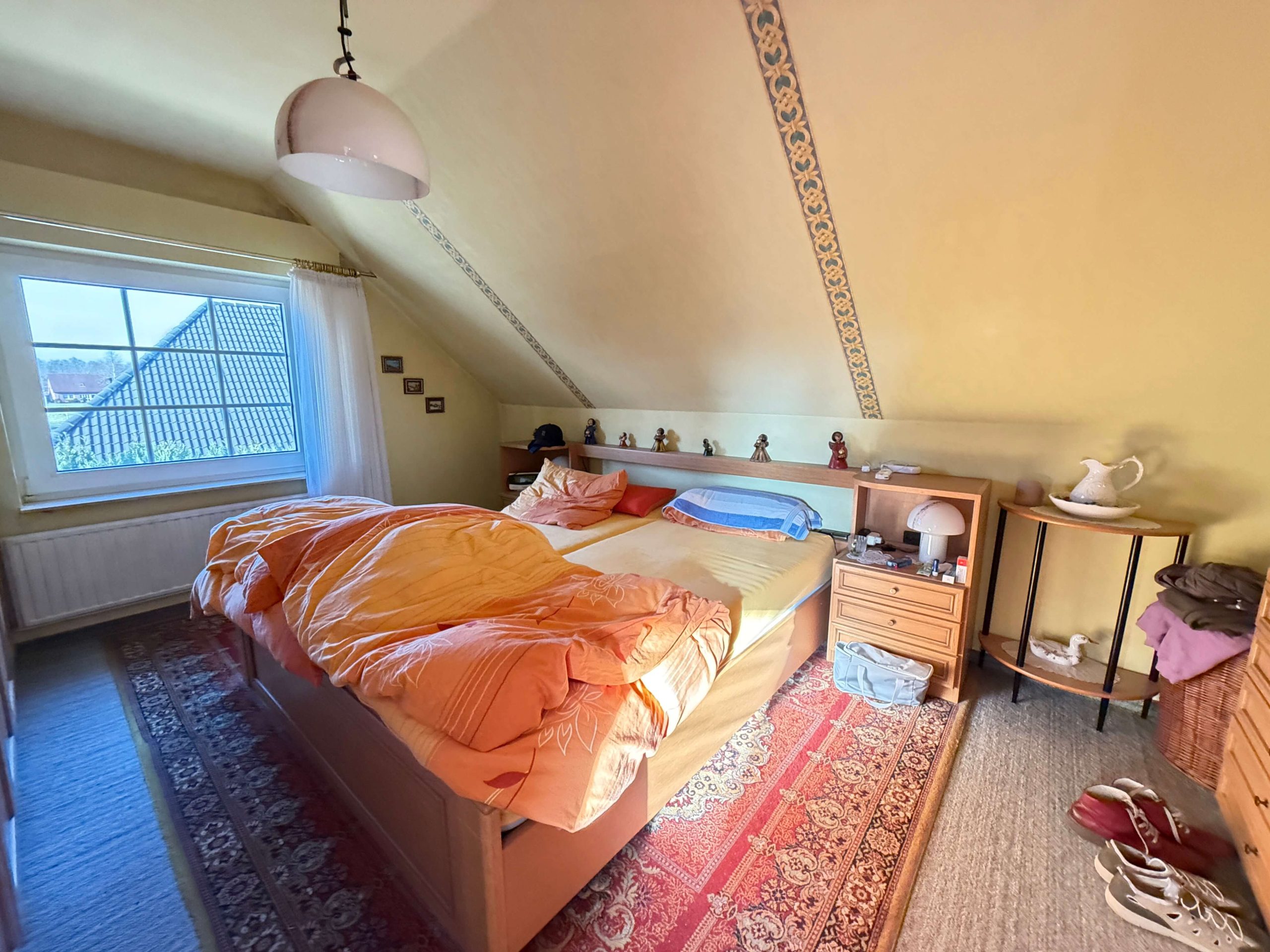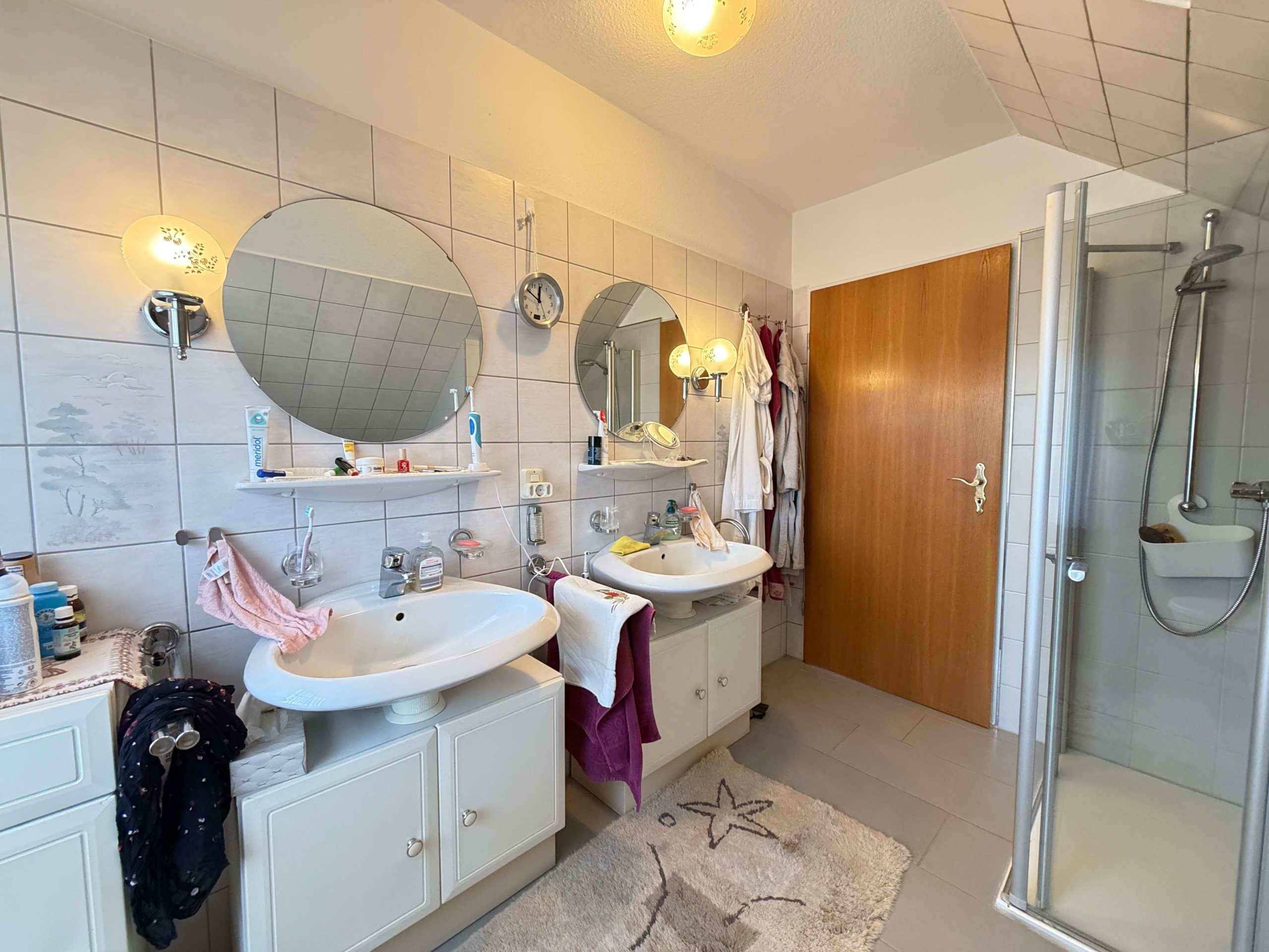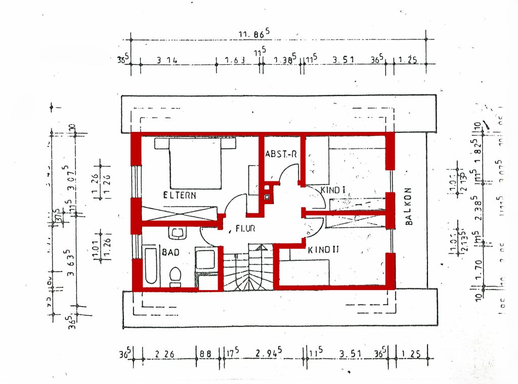 Im Obergeschoss stehen drei Schlafzimmer zur Verfügung, die flexibel als Elternschlafzimmer, Kinderzimmer, Gästezimmer oder Homeoffice genutzt werden können. Zwei der Schlafzimmer verfügen über einen direkten Zugang zum Balkon, von dem aus sich ein schöner Blick in die ruhige Nachbarschaft bietet. Das Badezimmer im Obergeschoss ist mit einer Dusche ausgestattet und gefliest. In den übrigen Räumen des Obergeschosses sorgen Teppichböden für eine angenehme Wohnlichkeit. Das Haus ist mit Sprossen-Kunststofffenstern mit Zweifachverglasung sowie Rollläden ausgestattet, die zu einem guten Wohnklima beitragen.
