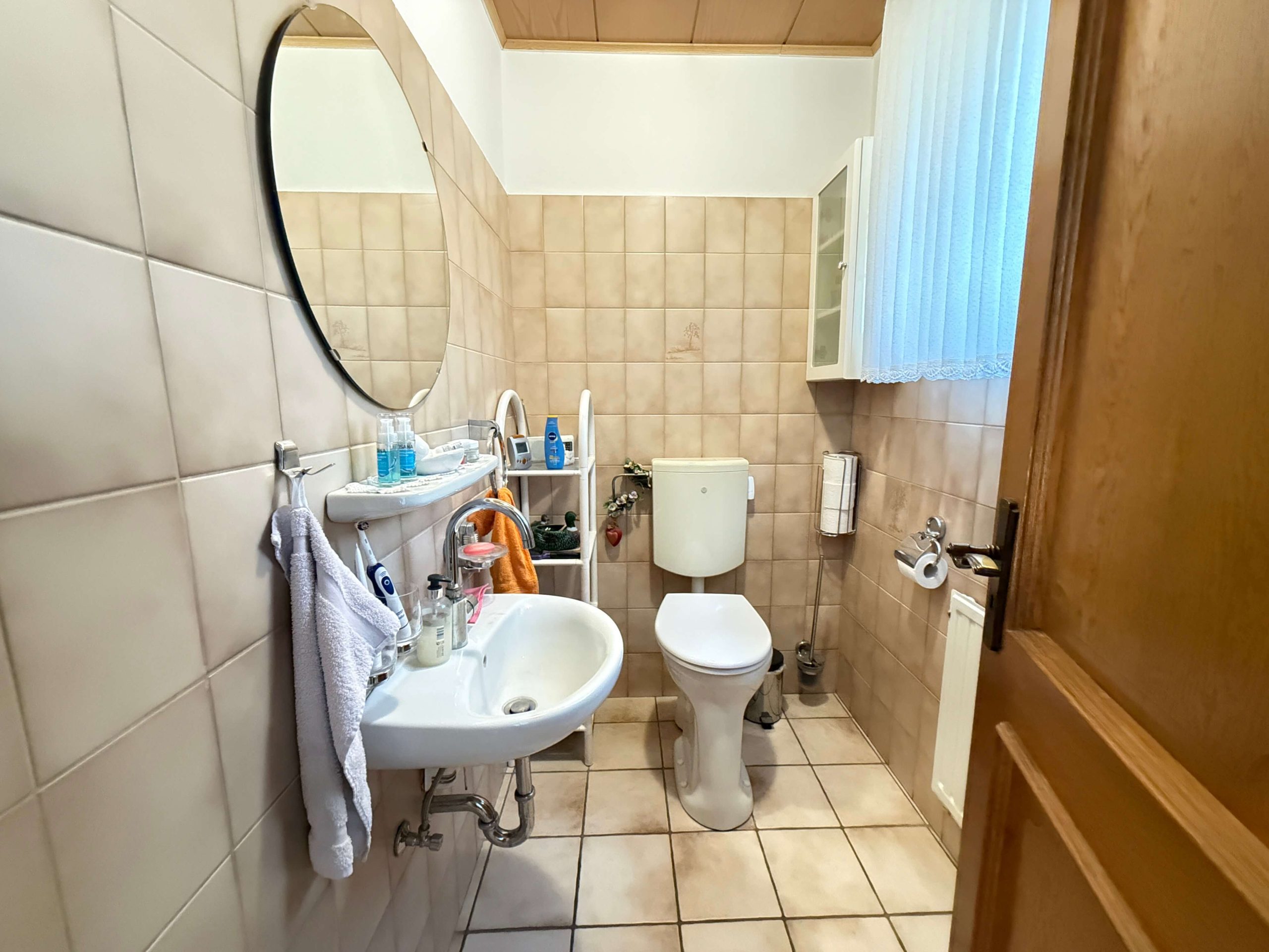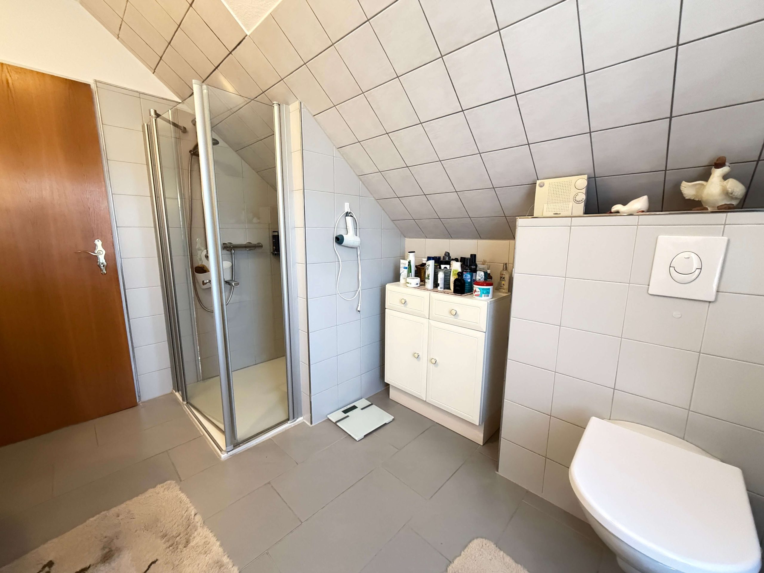 Die Bodenbeläge im Erdgeschoss sind mit pflegeleichten Fliesen ausgestattet. Ergänzt wird diese Wohnebene durch ein Gäste-WC, das den Grundriss sinnvoll abrundet.