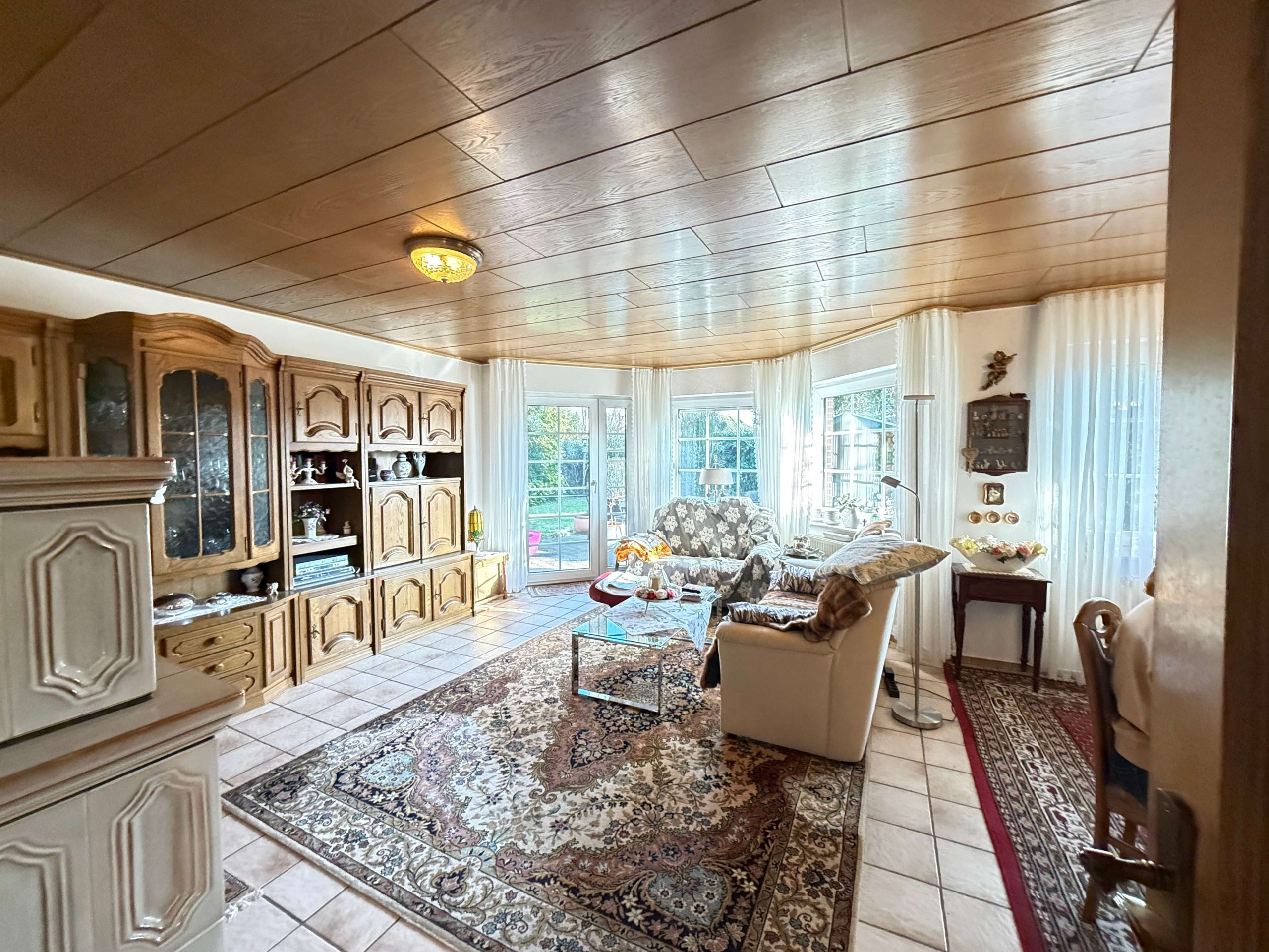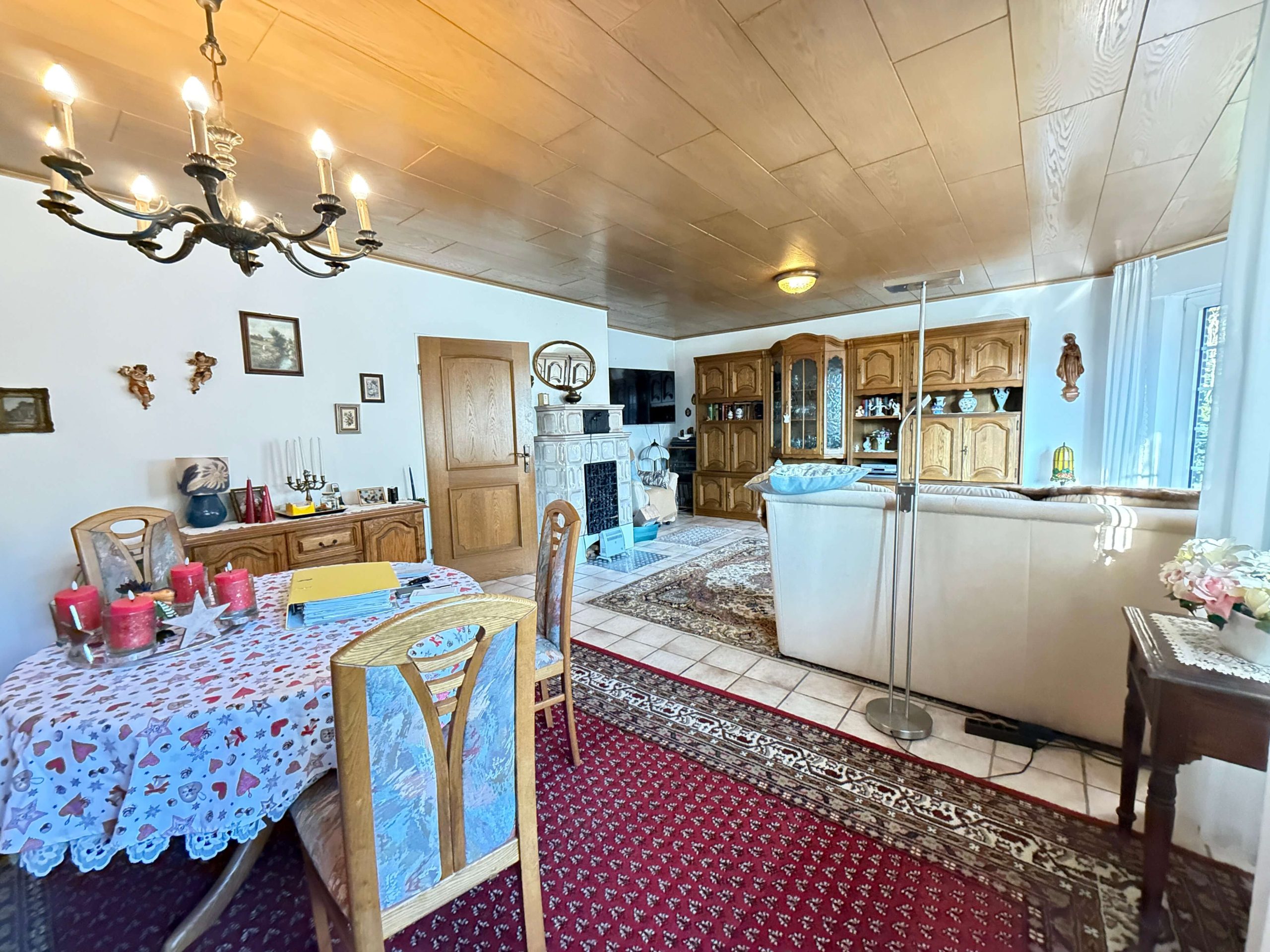 Bereits beim Betreten des Hauses wird deutlich, dass hier ein solides Zuhause mit angenehmer Wohnatmosphäre geschaffen wurde. Das Erdgeschoss bildet den Mittelpunkt des täglichen Lebens. Herzstück ist das großzügige Wohnzimmer mit charmantem Erkerausbau, der für viel Tageslicht sorgt und dem Raum eine besondere architektonische Note verleiht. Ein Kachelofen sorgt insbesondere in der kälteren Jahreszeit für eine behagliche Wärme und unterstreicht den wohnlichen Charakter des Hauses. Von hier aus besteht ein direkter Zugang zur Terrasse, die sich ideal für entspannte Stunden im Freien, Familienfeiern oder gesellige Abende eignet.