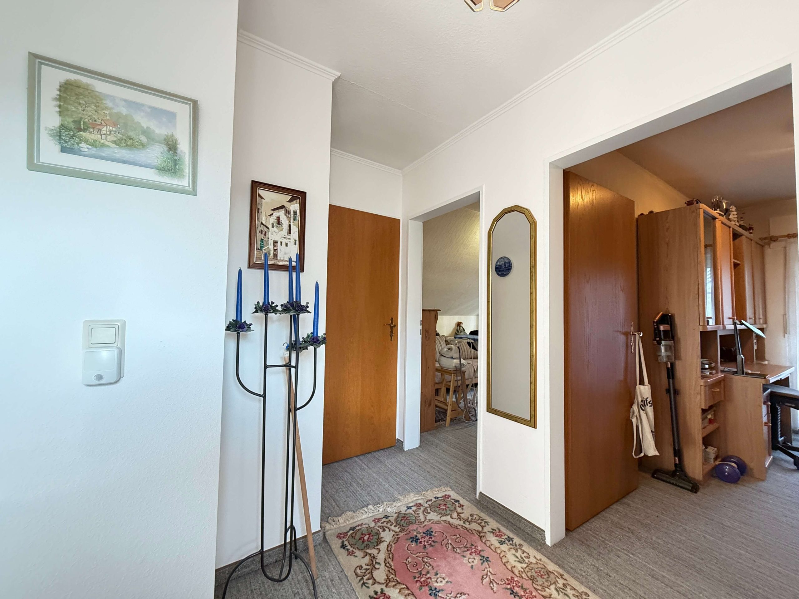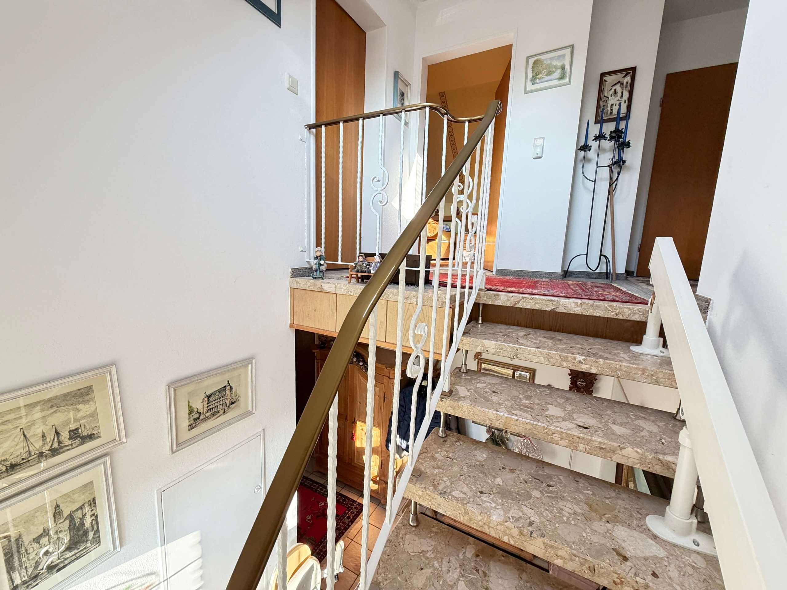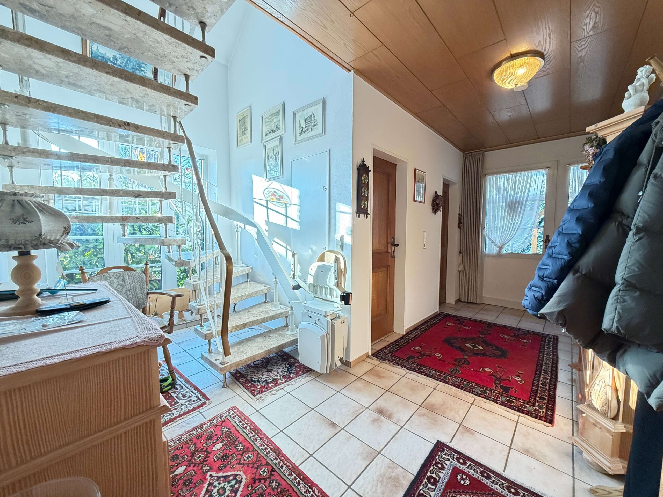 Über das zentrale Treppenhaus gelangt man in das Obergeschoss. Besonders hervorzuheben ist der moderne Treppenlift, der ebenfalls im Kaufpreis enthalten ist und einen komfortablen sowie nahezu barrierefreien Zugang in die obere Etage ermöglicht – ein großer Vorteil für das altersgerechte Wohnen oder bei eingeschränkter Mobilität.
