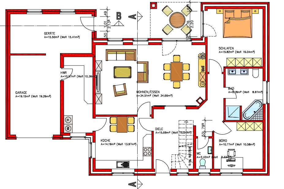 Zum Objekt gehört eine großräumige Garage mit angrenzendem Geräteraum und direktem Zugang zum Wohnbereich. Der Garagenboden wird mit Pflastersteinen versehen.