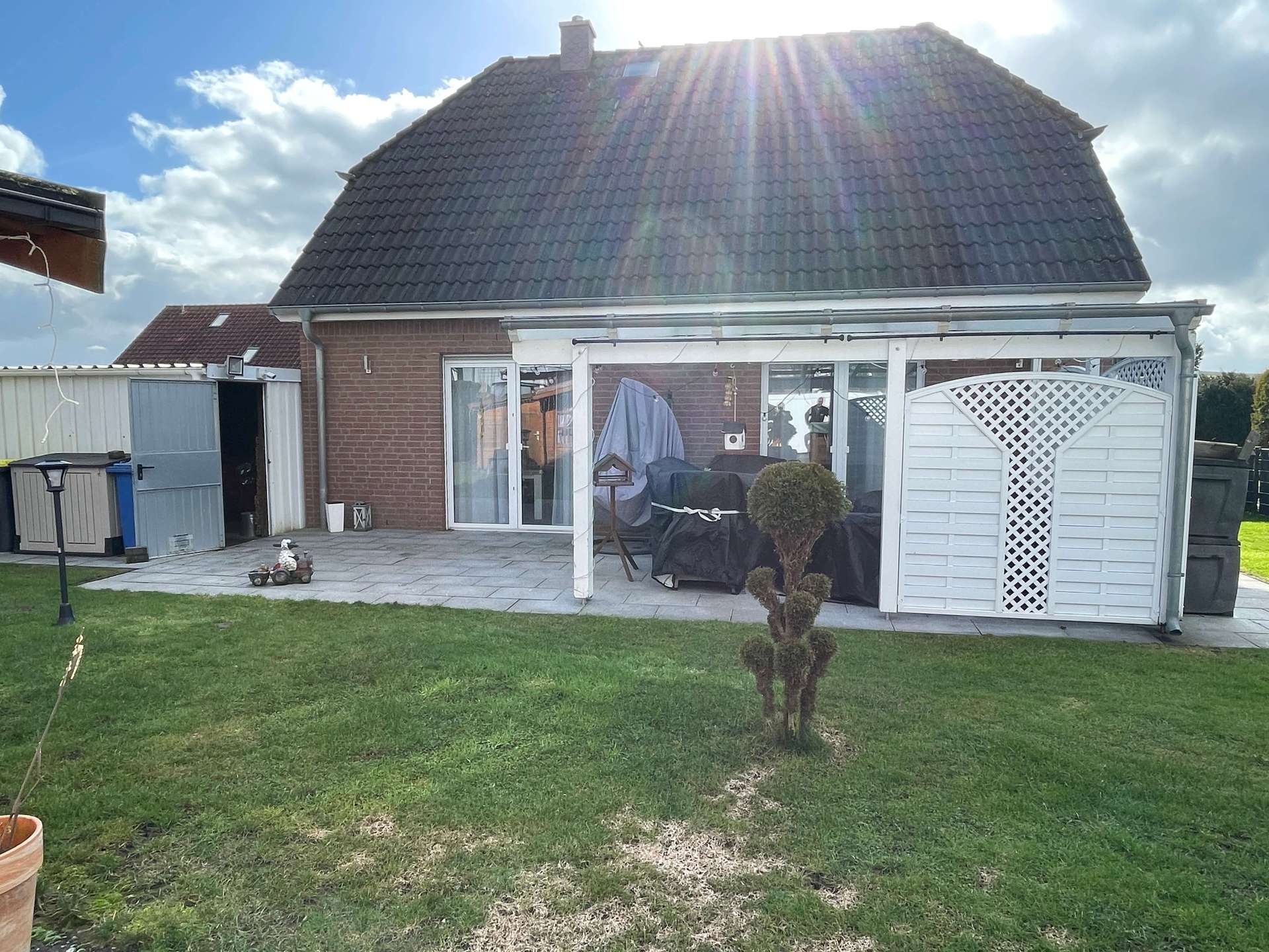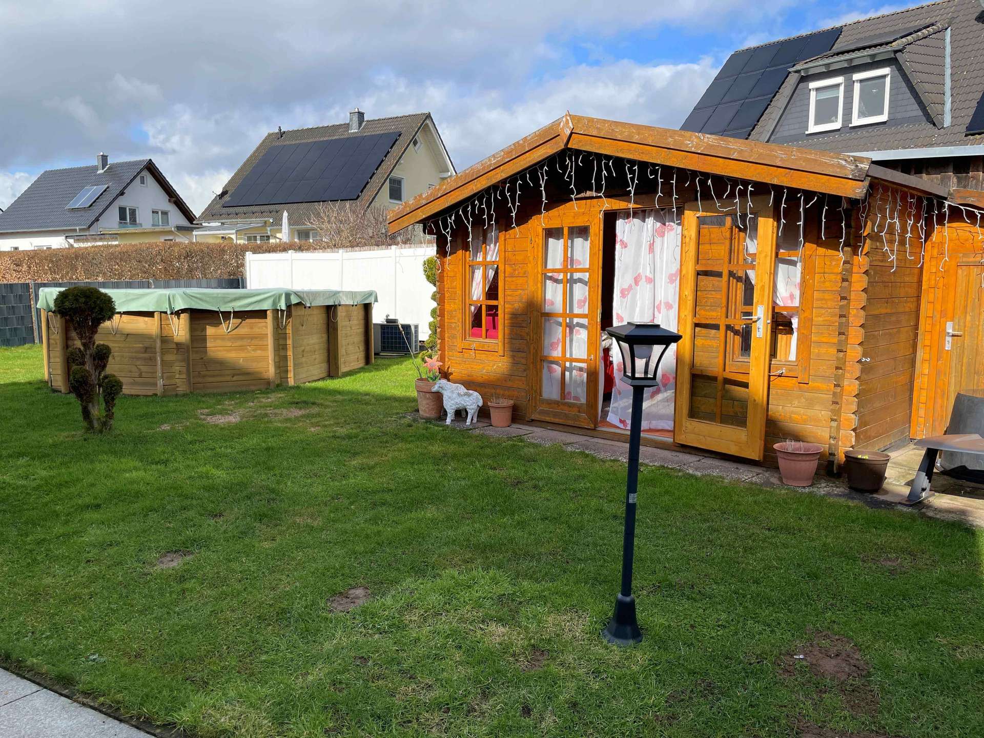 Der Außenbereich ist ein echtes Highlight: Der Swimmingpool (5 x 3 m) mit Wärmepumpe bietet Badespaß im Sommer, das Gartenhaus bietet Platz für Geräte oder Hobbyaktivitäten. Die überdachte Terrasse lädt zu entspannten Stunden ein, während das gepflegte, komplett eingezäunte Grundstück ausreichend Raum für Garten, Spiel und Freizeitgestaltung bietet. Abgerundet wird das Angebot durch die direkt am Wohnhaus befindliche Garage mit Betonboden und elektrischem Tor.