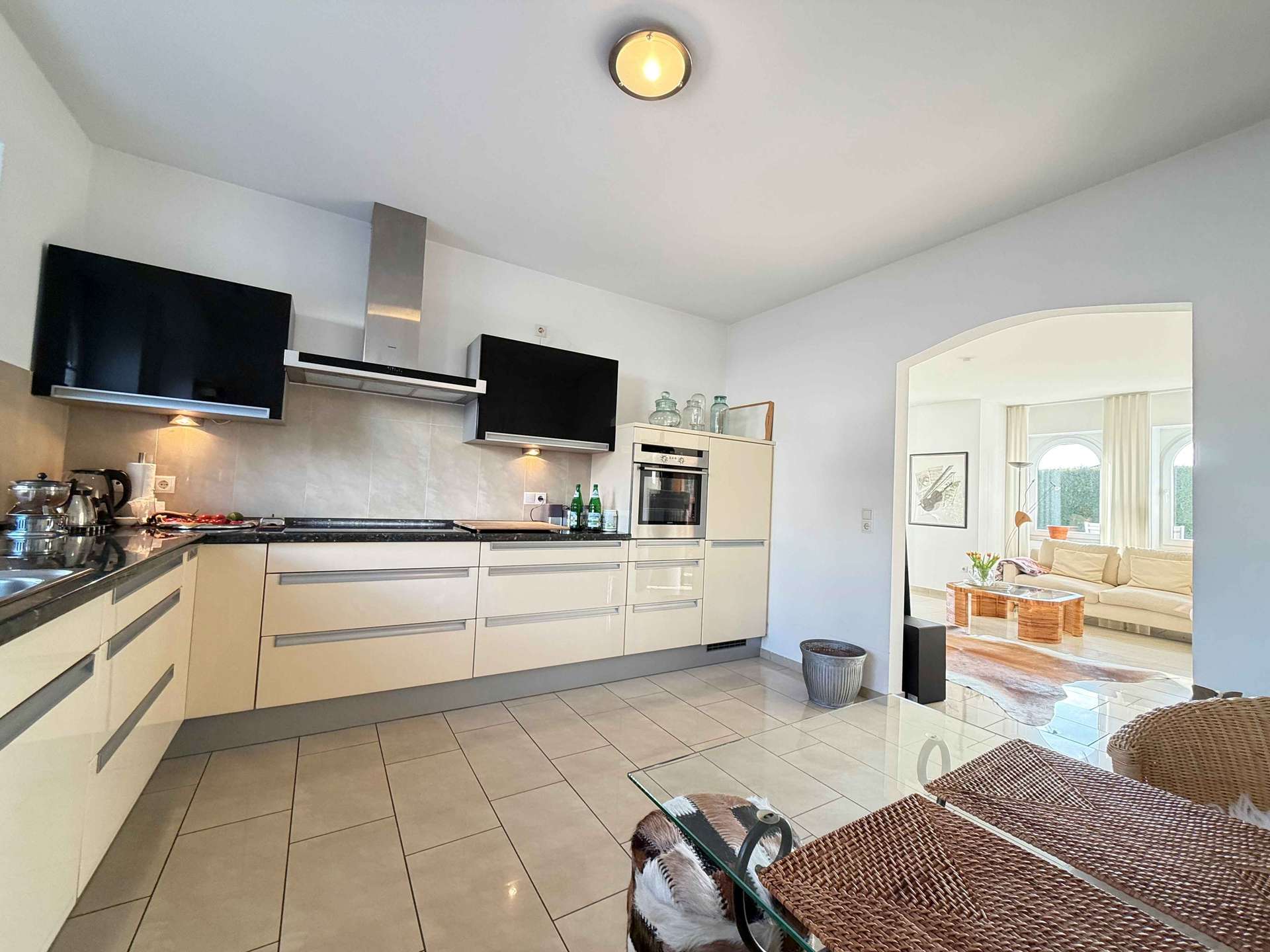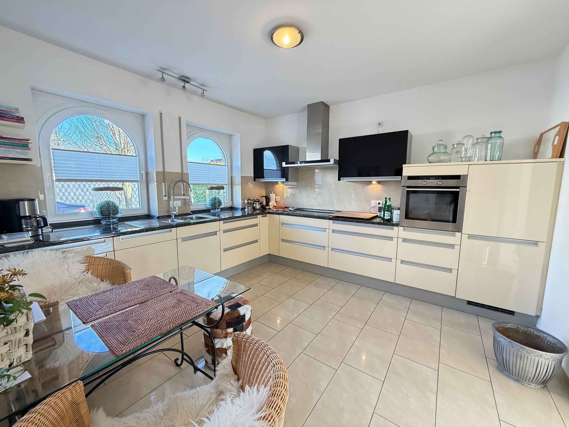Das Erdgeschoss überzeugt durch ein offenes, lichtdurchflutetes Raumgefühl. Herzstück ist der großzügige Wohnbereich mit zwei Erkern, die nicht nur architektonisch beeindrucken, sondern auch für eine außergewöhnliche Lichtdurchflutung sorgen. Zwischen Wohnzimmer und Diele befindet sich eine große Doppelglastür, die Transparenz und Eleganz verbindet. Ein großzügiger offener Durchgang führt vom Wohnzimmer in die Küche und schafft ein modernes, kommunikatives Wohnkonzept. Die hochwertige Einbauküche mit erstklassigen Elektrogeräten ist bereits im Kaufpreis enthalten und fügt sich stilvoll in das Gesamtbild ein.