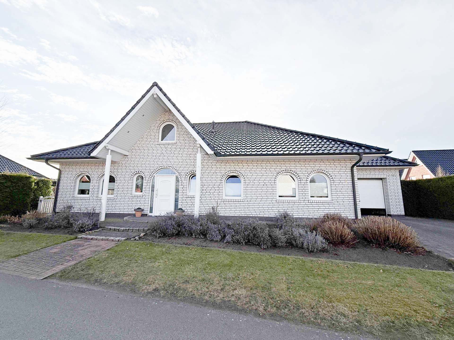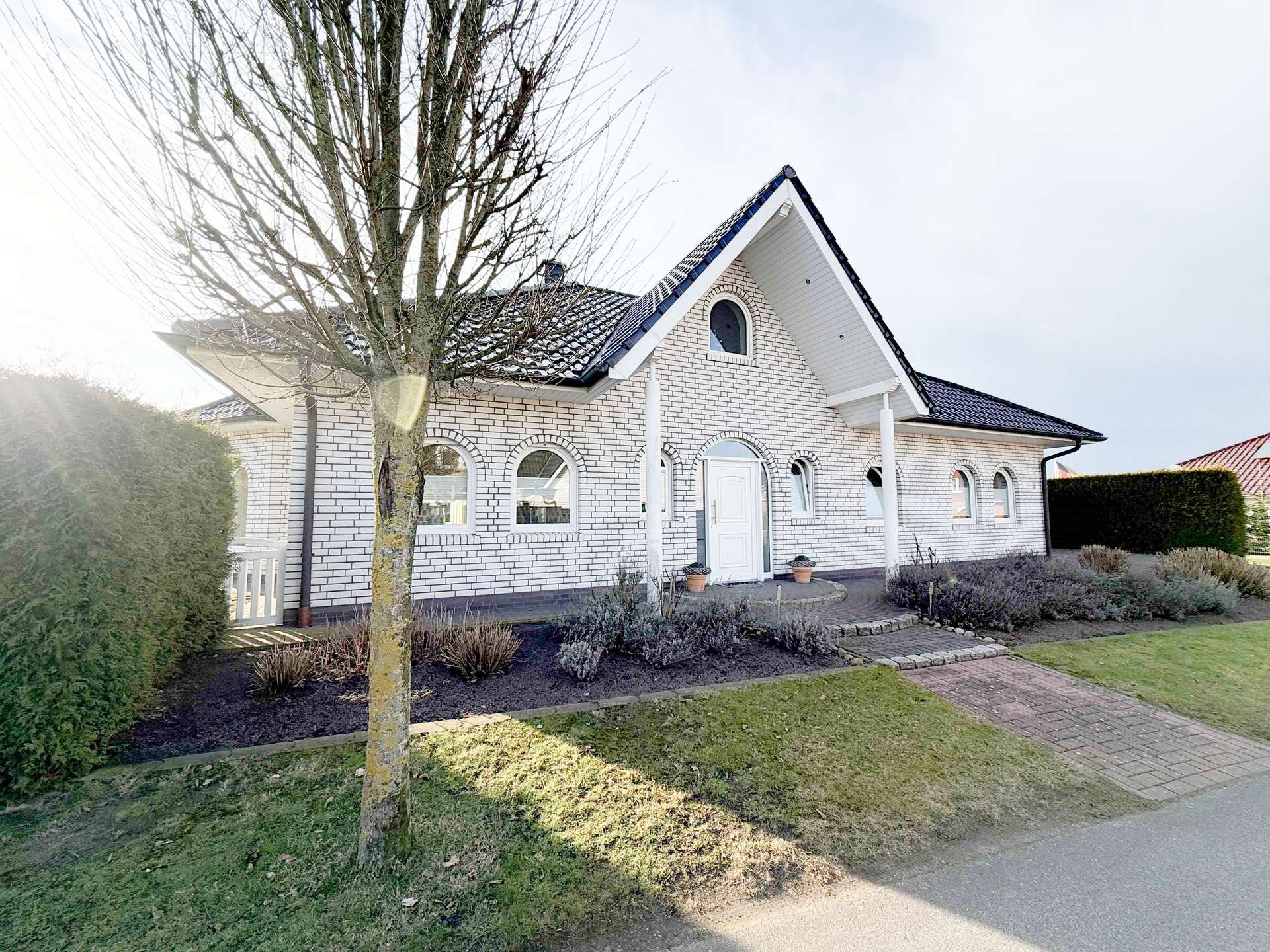 Die elegante Kombination aus weißem Klinker und schwarzen Lackdachziegeln verleiht dem Gebäude eine zeitlose, wertige Ausstrahlung. Charakteristische Rundbögen bei einzelnen Fenstern im Erdgeschoss unterstreichen die klassische Architektur und setzen stilvolle Akzente. Der überdachte Säuleneingangsbereich schafft einen repräsentativen Zugang zum Haus und vermittelt bereits beim Betreten einen hochwertigen Eindruck. Die freistehende Garage mit separatem Walmdach fügt sich optisch harmonisch in das Gesamtbild ein.