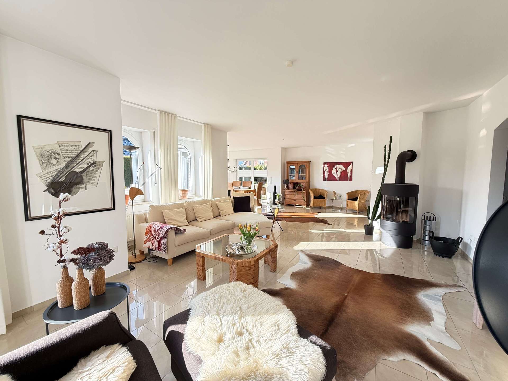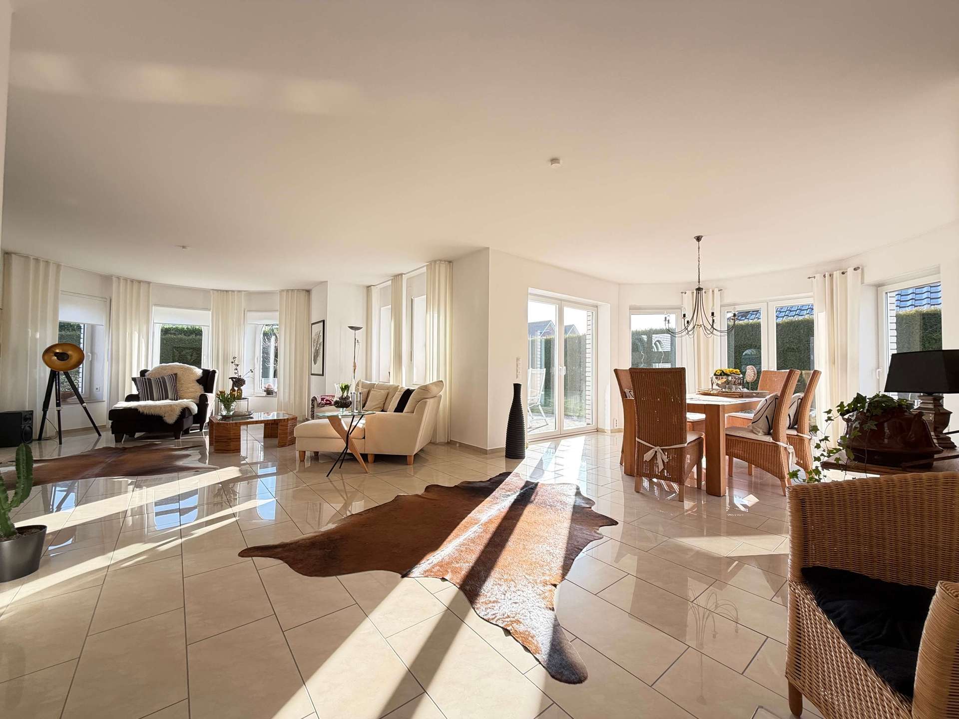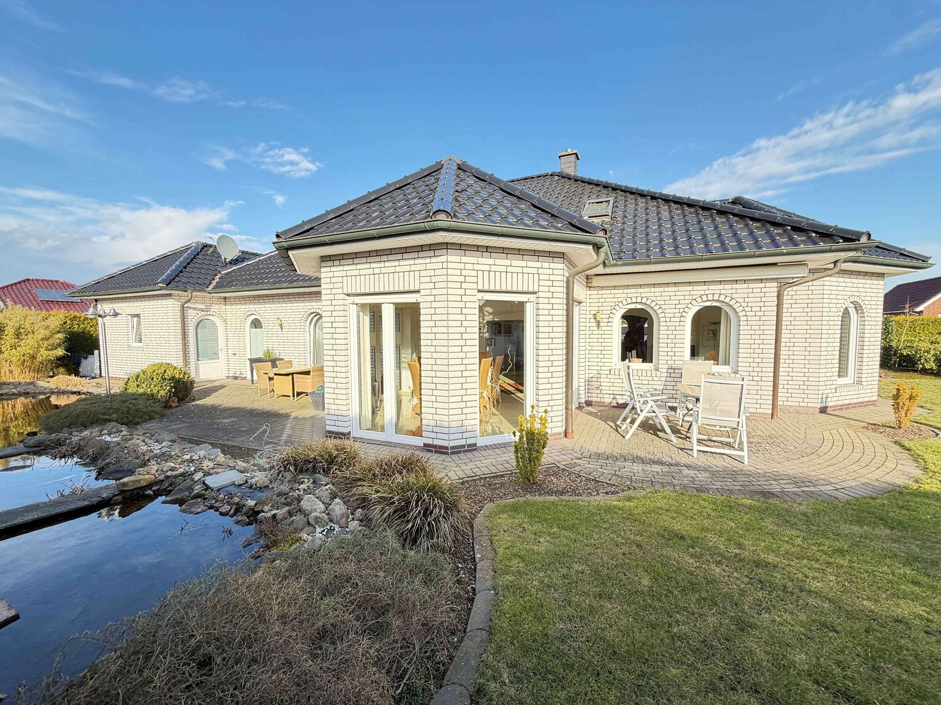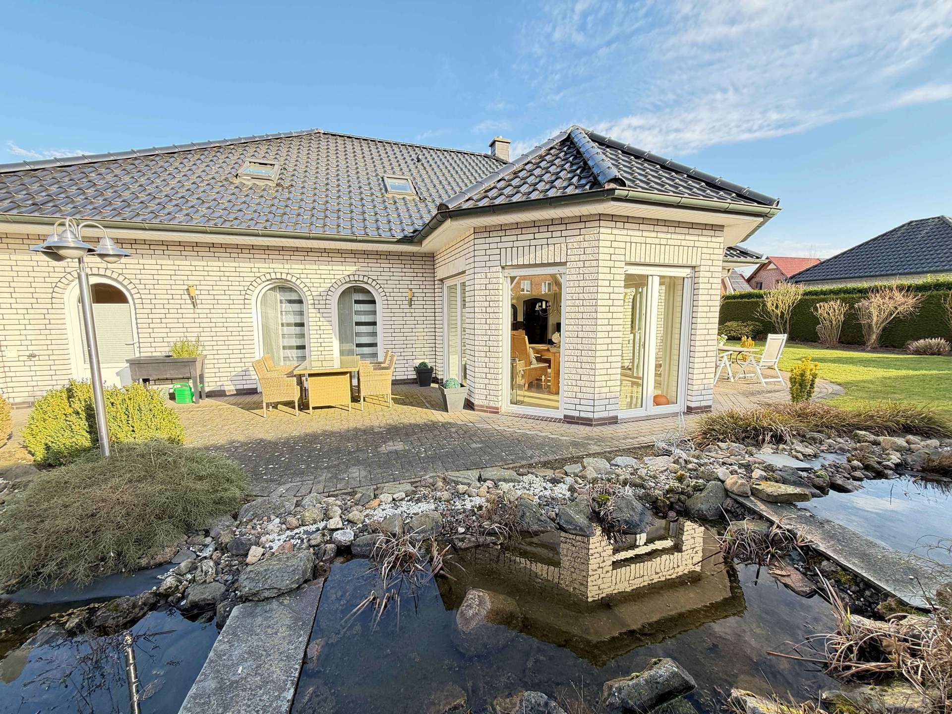 Auf einer großzügigen Wohnfläche von ca. 215 m² entfaltet sich ein durchdachtes Raumkonzept, das Offenheit, Licht und Komfort harmonisch miteinander verbindet. Das ca. 804 m² große Eigentumsgrundstück ist liebevoll angelegt und bietet mit Sonnenterrasse, dekorativem Gartenteich sowie einem praktischen Gartenhaus eine attraktive Außenanlage mit hoher Aufenthaltsqualität.