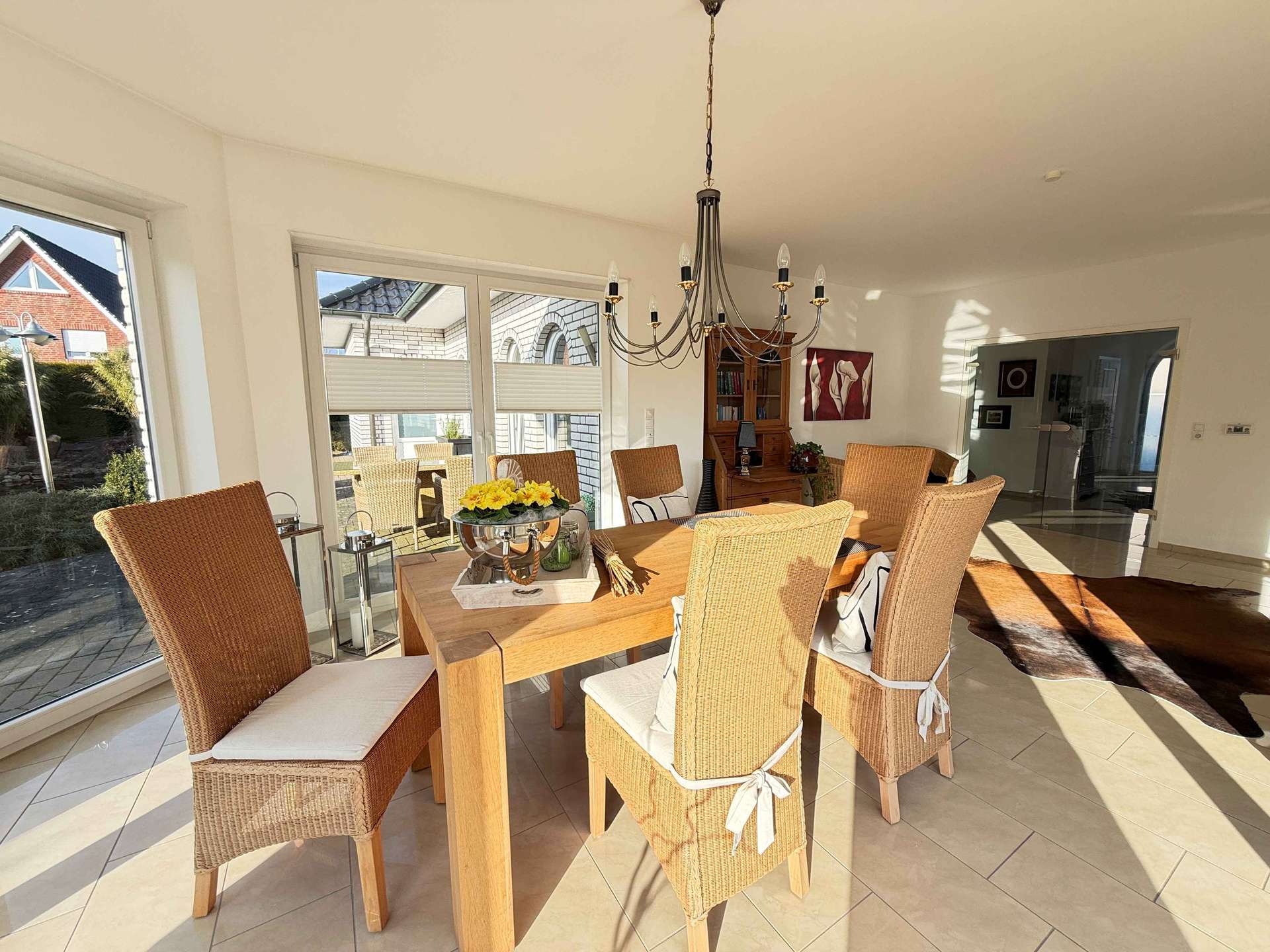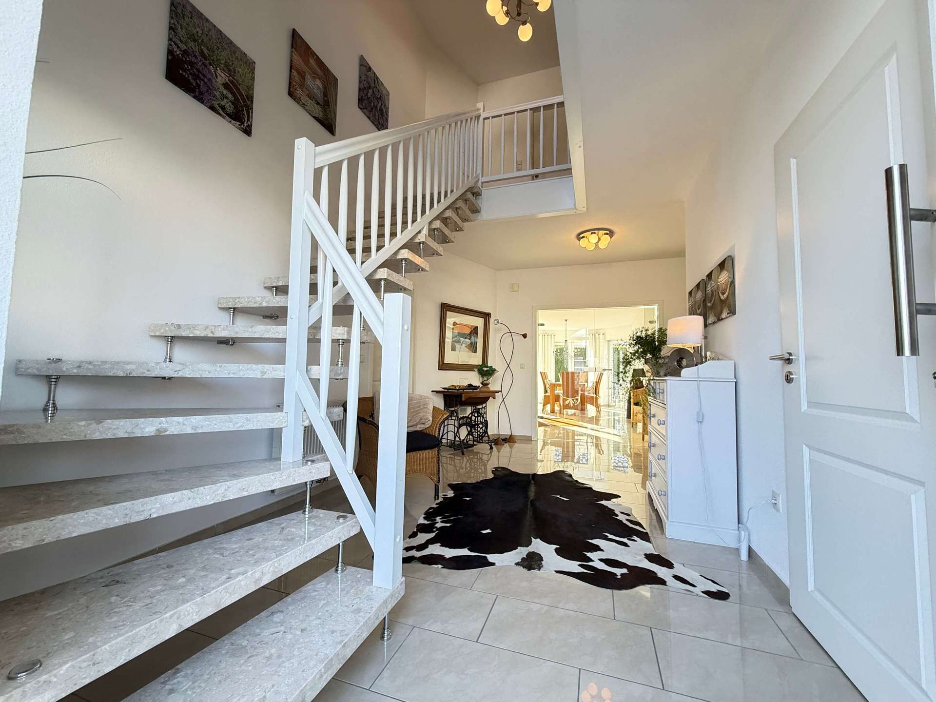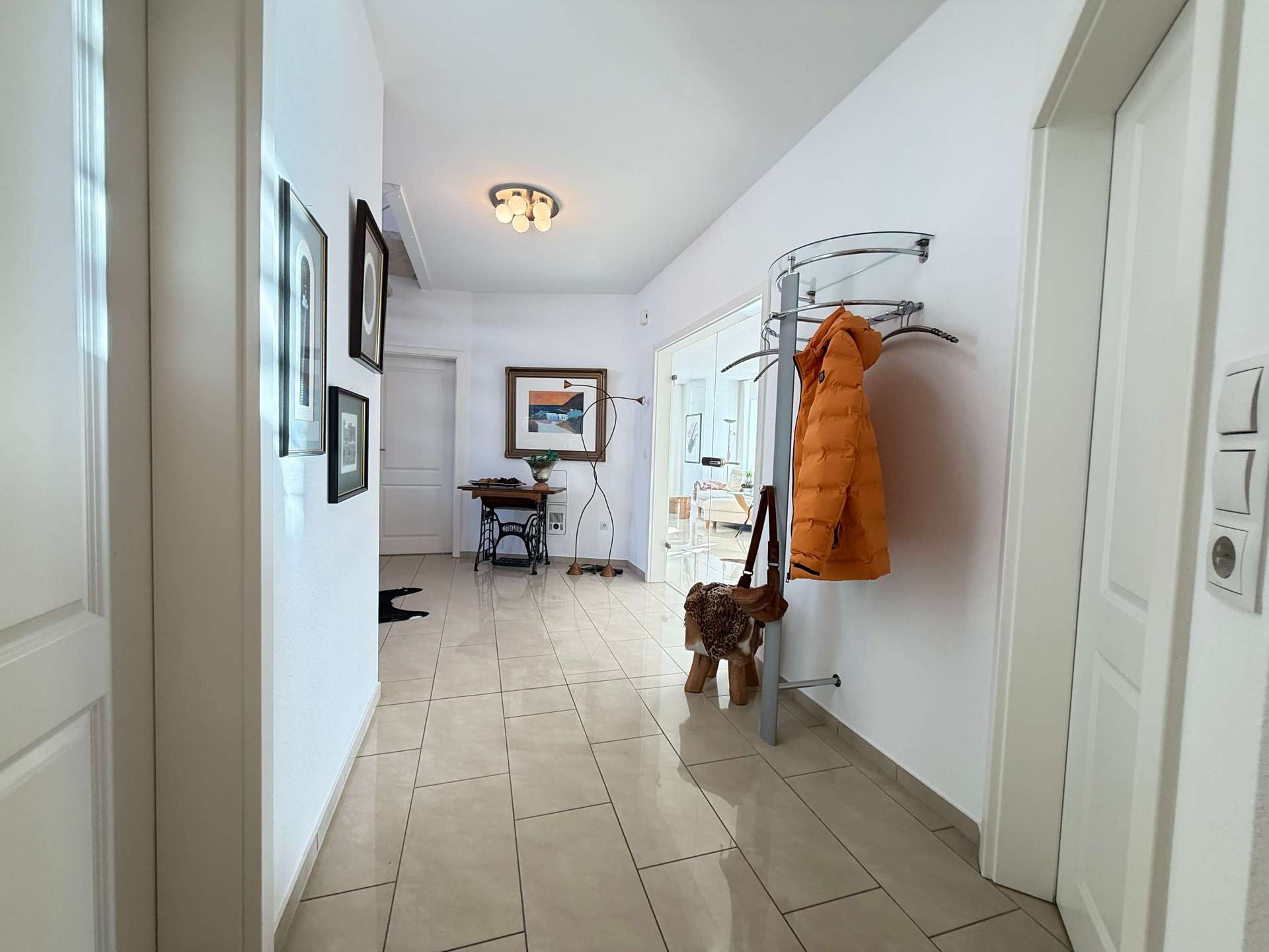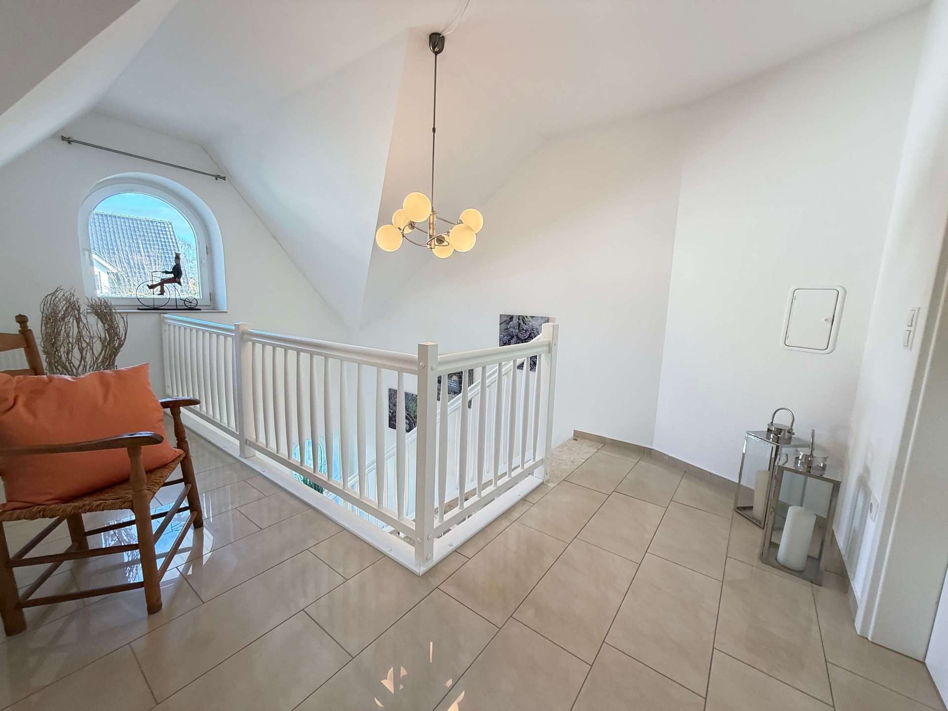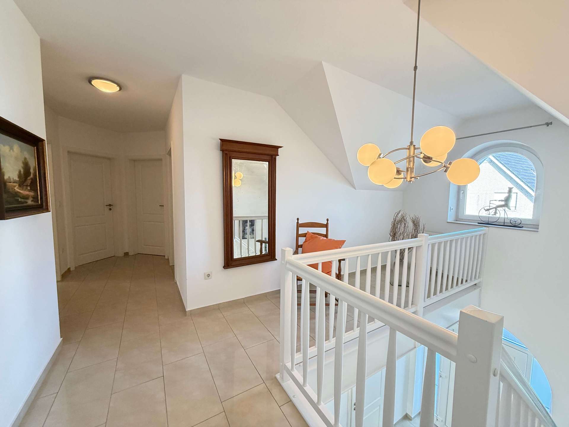 Im gesamten Erdgeschoss wurden großformatige, formschöne Bodenfliesen verlegt, die dem Haus eine repräsentative und zugleich pflegeleichte Note verleihen. Der Flur im Obergeschoss ist ebenfalls gefliest, während die Schlafzimmer mit hochwertigen Laminatböden ausgestattet wurden.