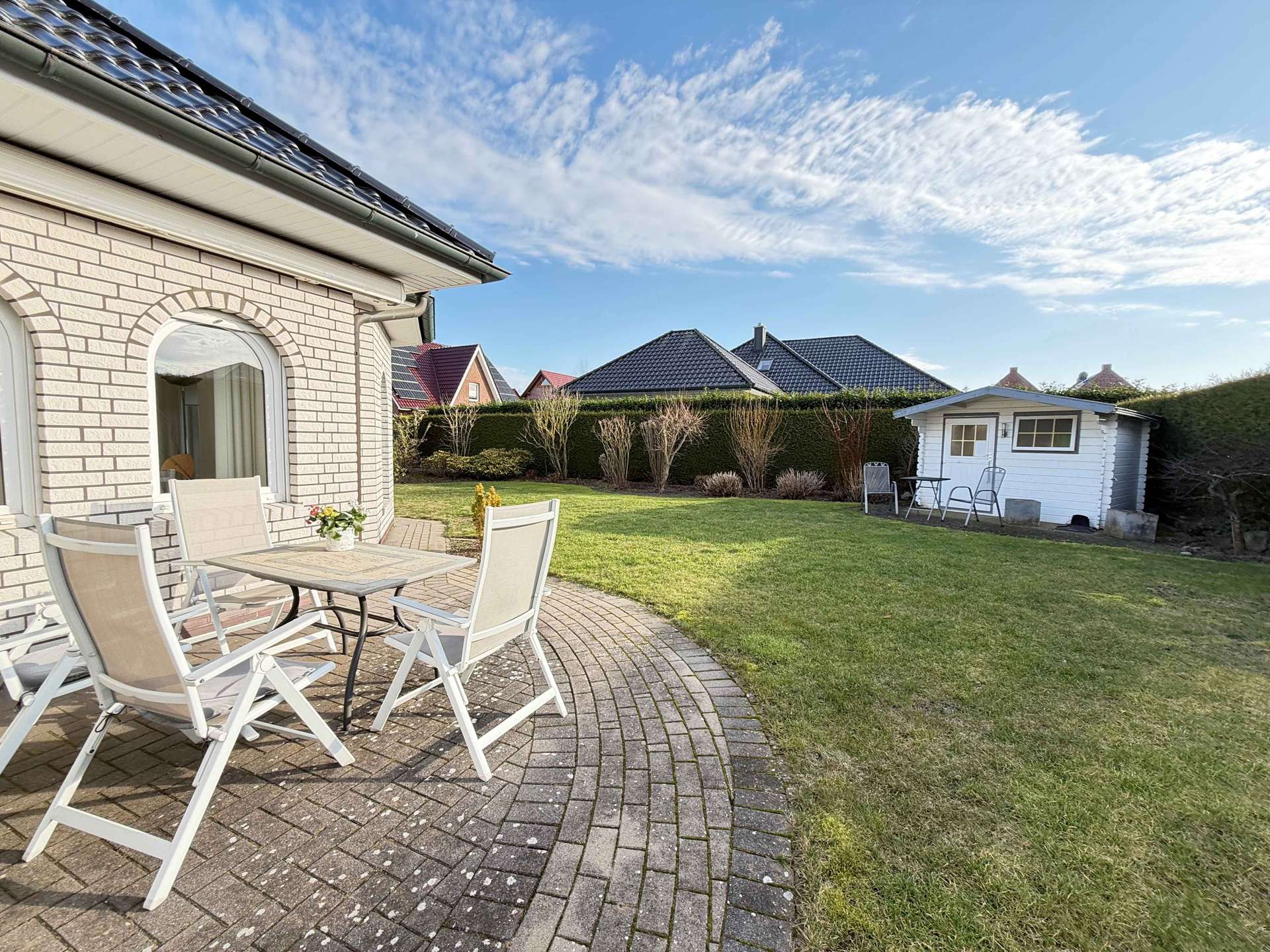 Der pflegeleicht angelegte Garten bietet mit seiner sonnigen Terrasse und dem geschmackvoll integrierten Gartenteich ein hohes Maß an Lebensqualität. Hier genießen Sie Privatsphäre und Ruhe in einem harmonisch gestalteten Umfeld. Das vorhandene Gartenhaus schafft zusätzliche Abstellfläche oder Raum für Hobby und Freizeit.