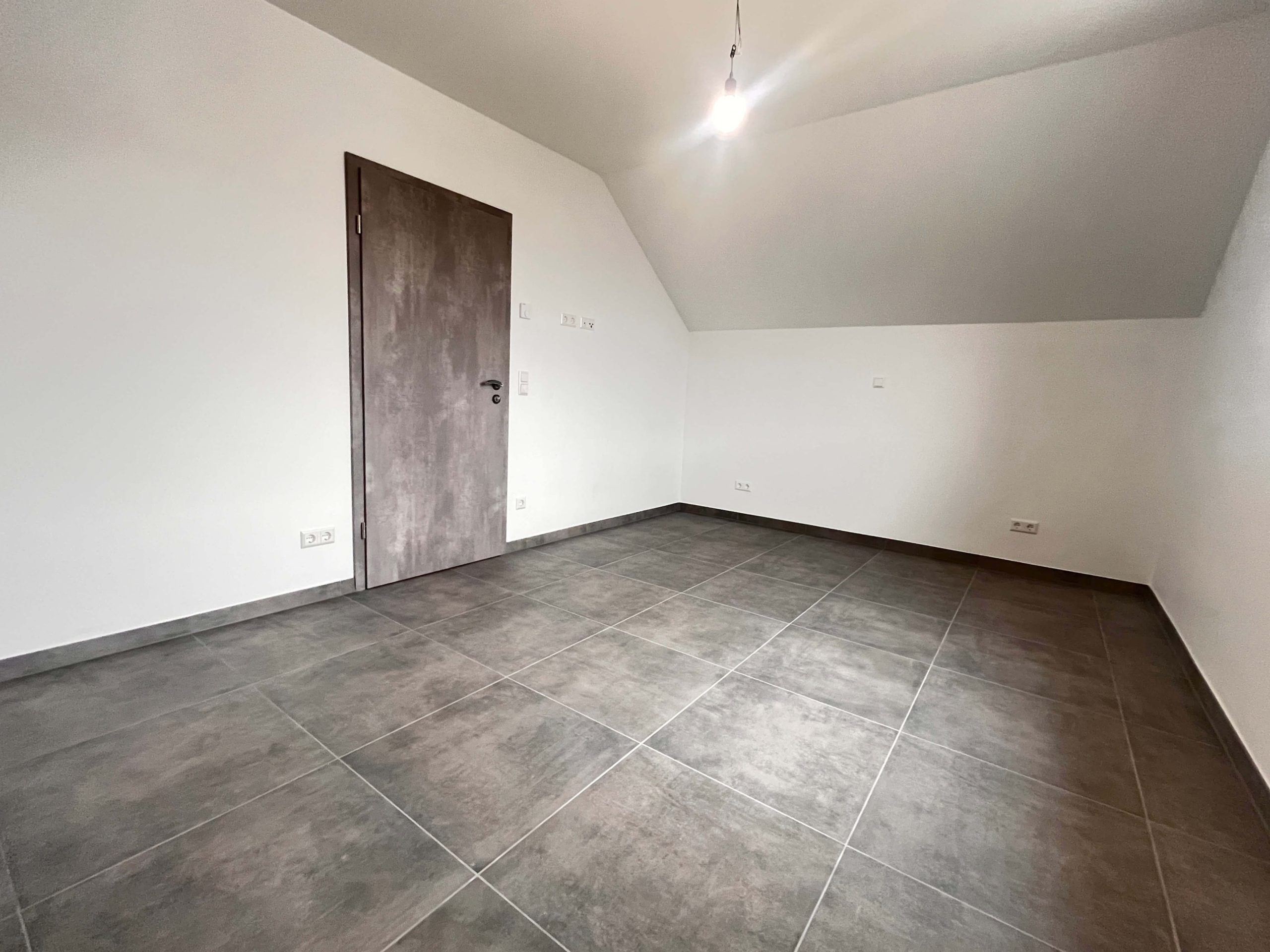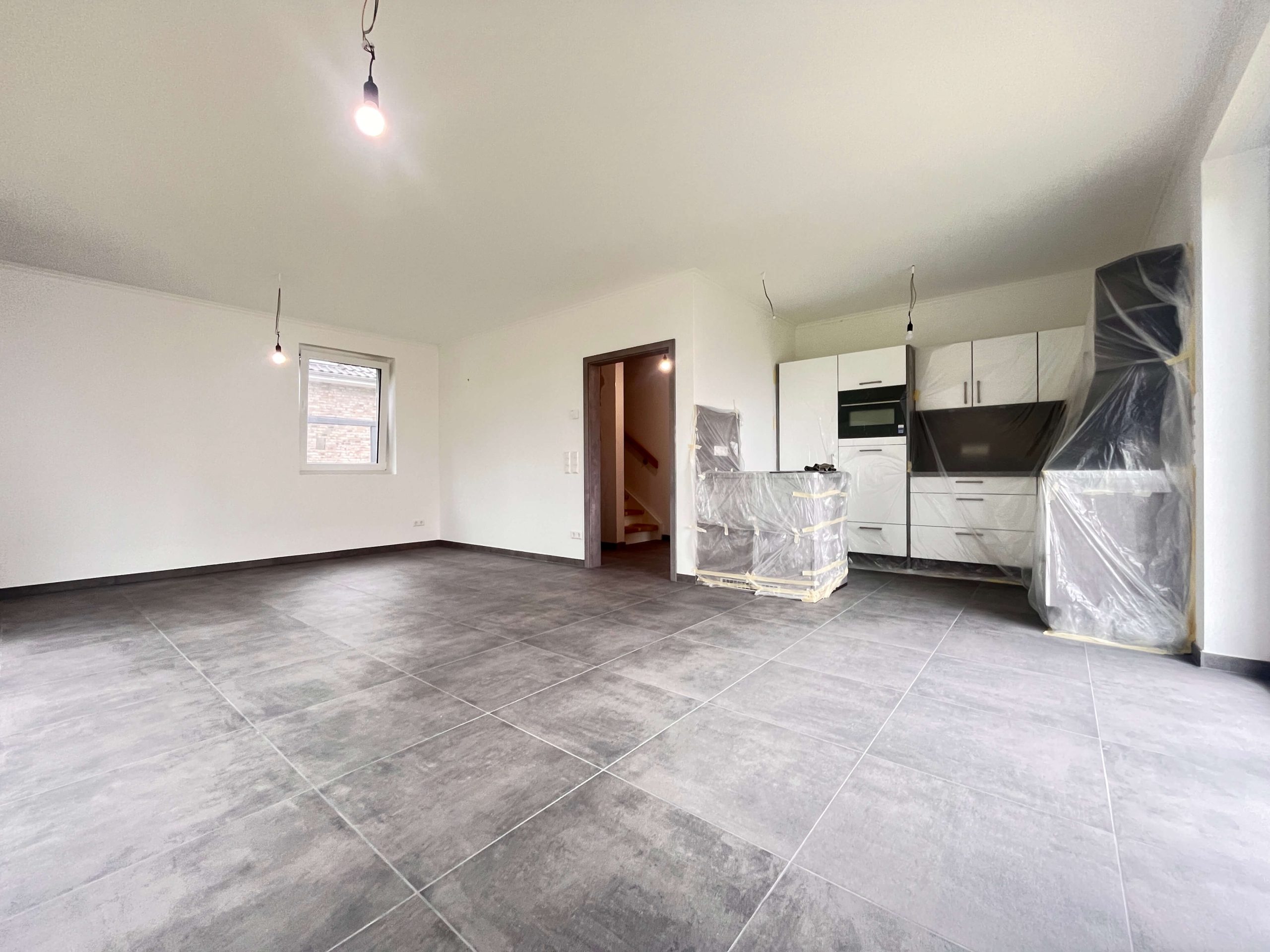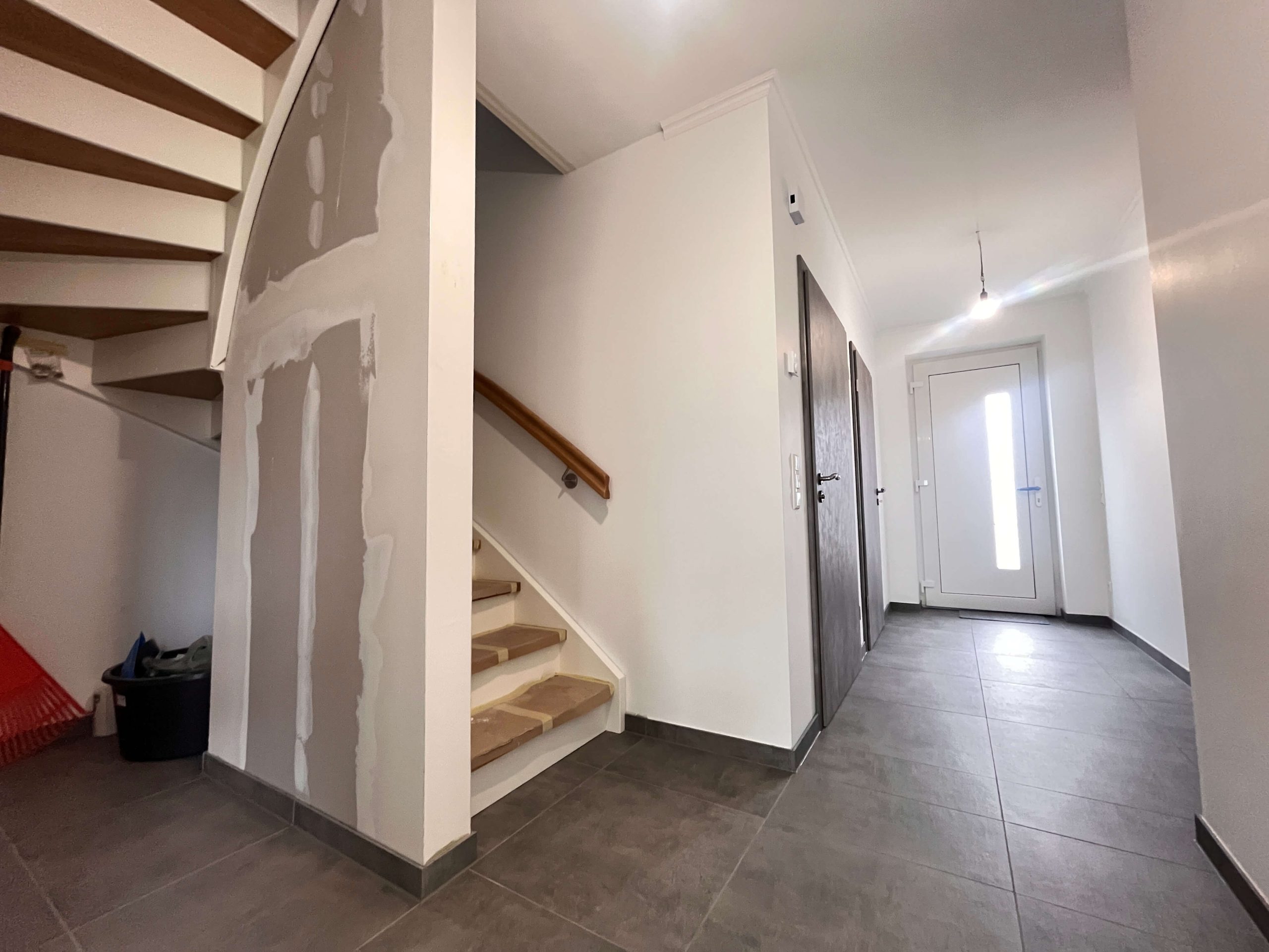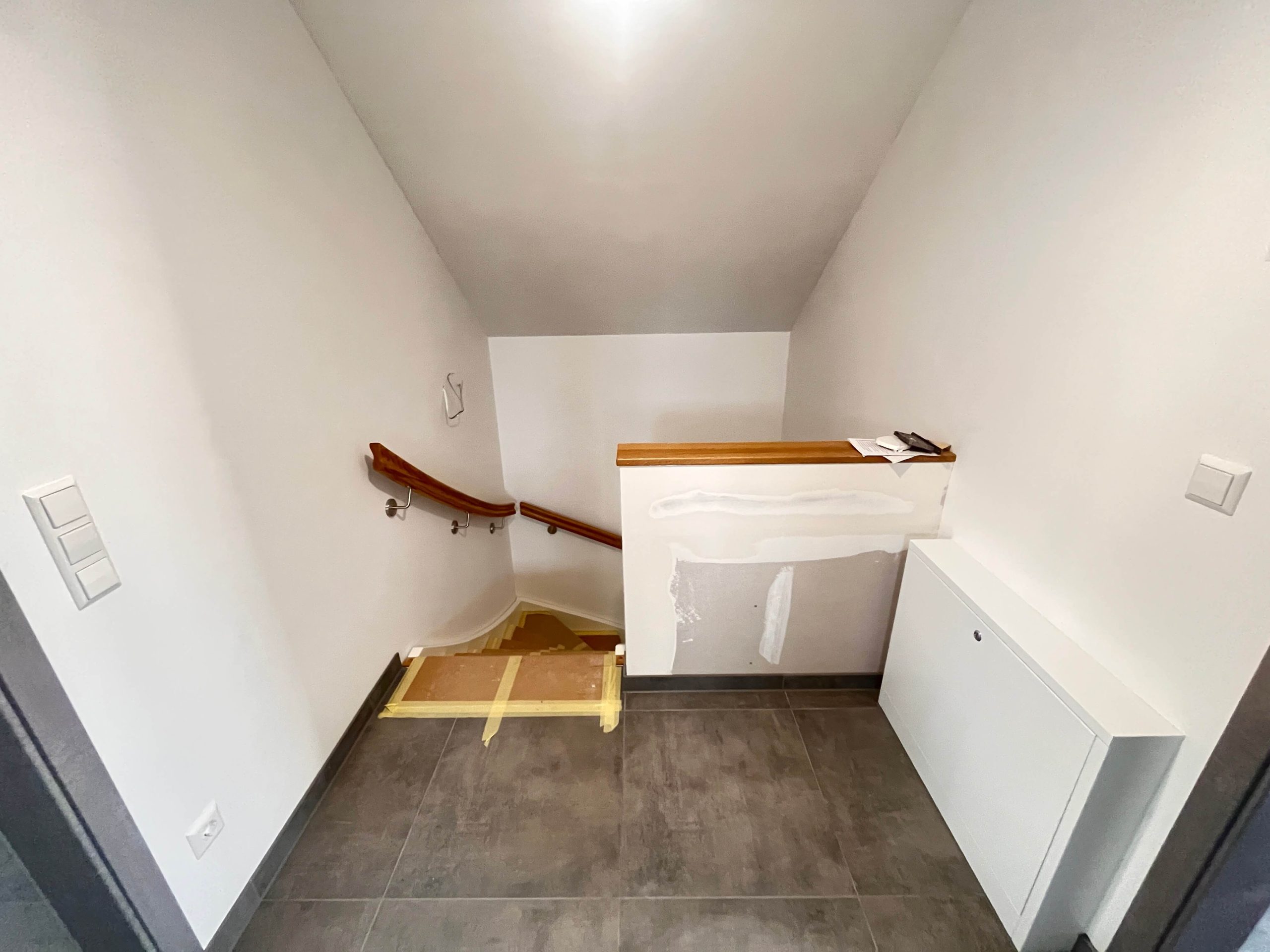 Die Bodenbeläge sind mit einheitlichen, hochwertigen Fliesen ausgestattet, die dem gesamten Wohnbereich eine klare, harmonische Linie verleihen. Besonders ins Auge fällt die geschmackvolle Treppe aus Holz, die als gestalterisches Highlight den Zugang zum Dachgeschoss bildet.