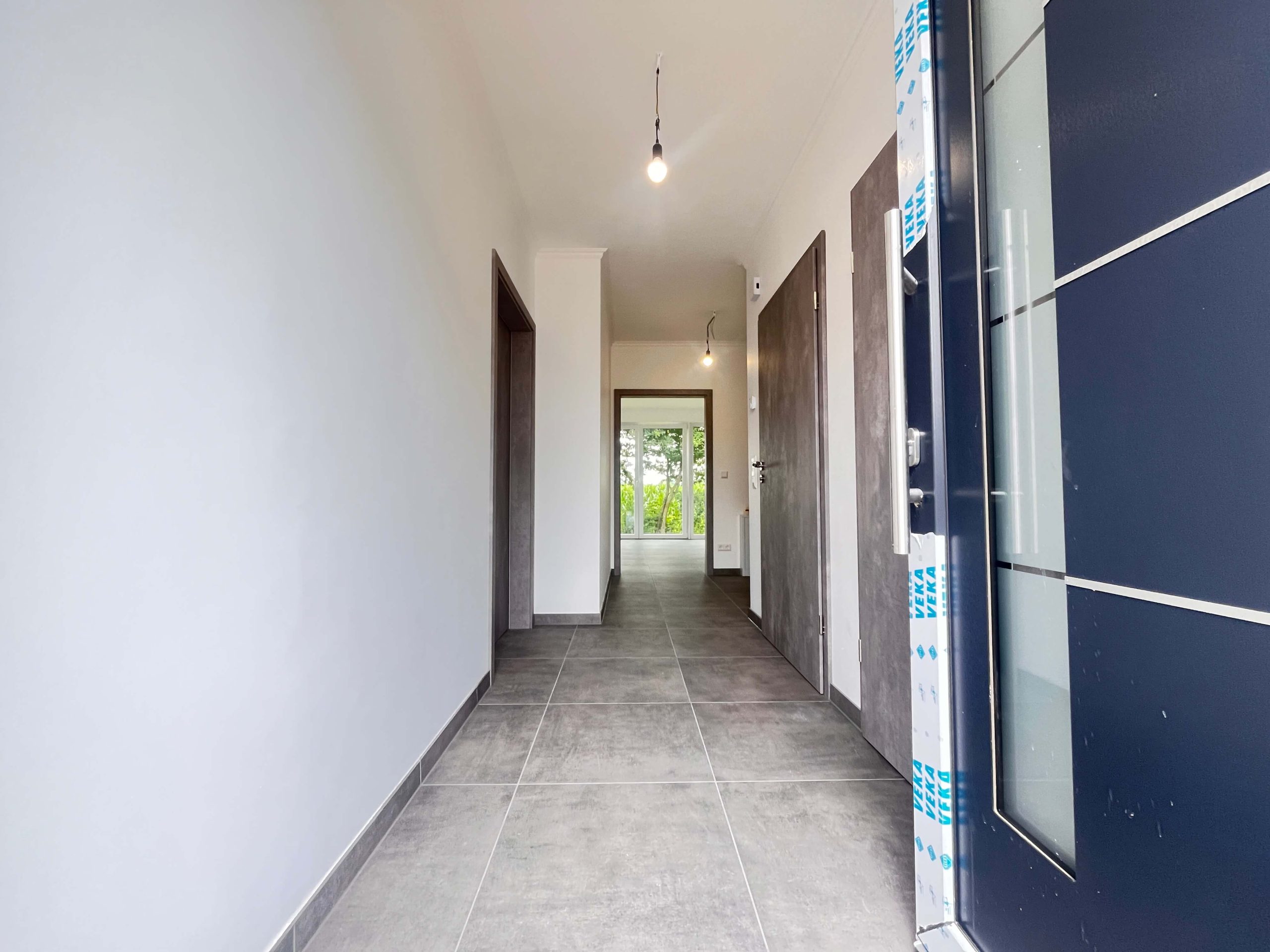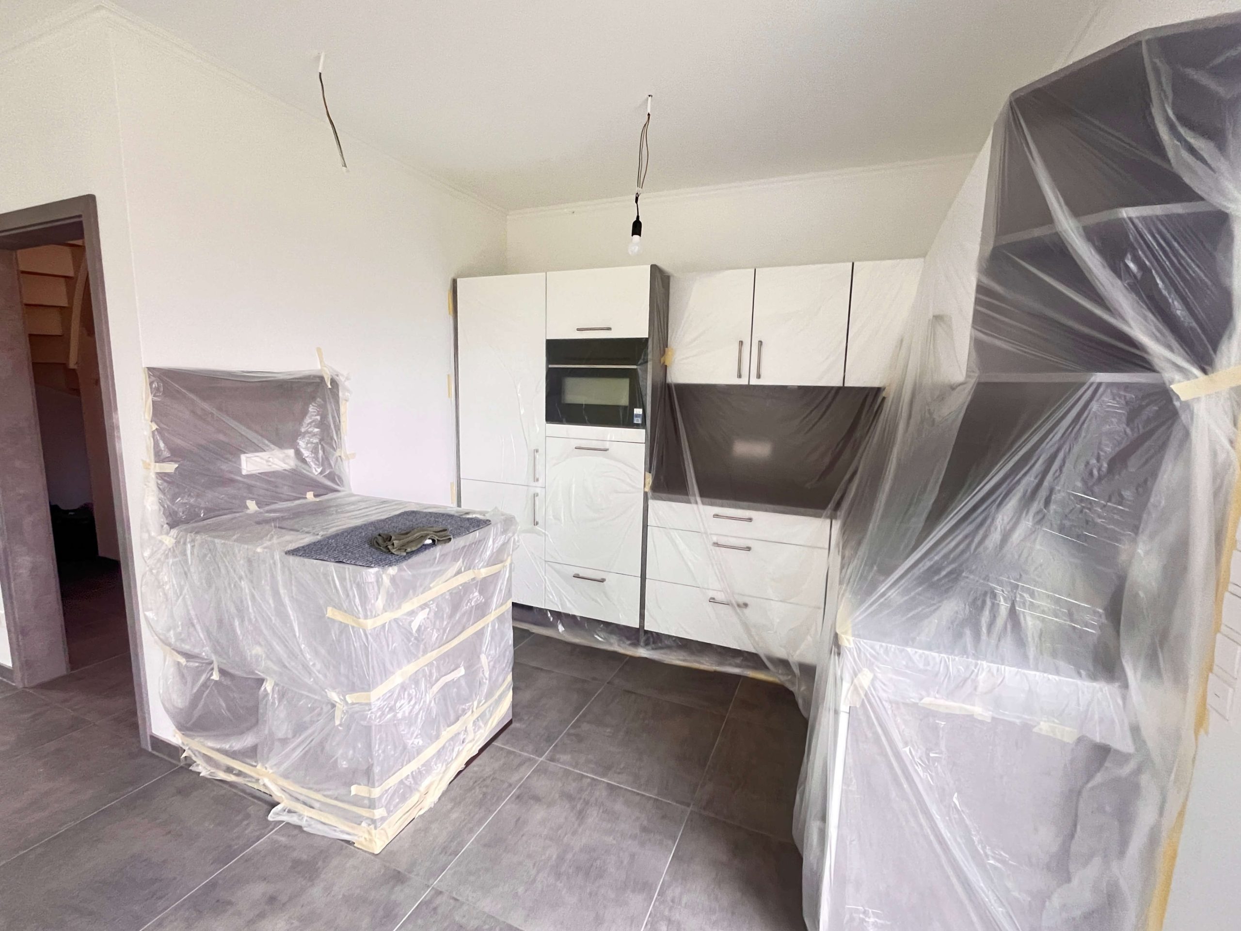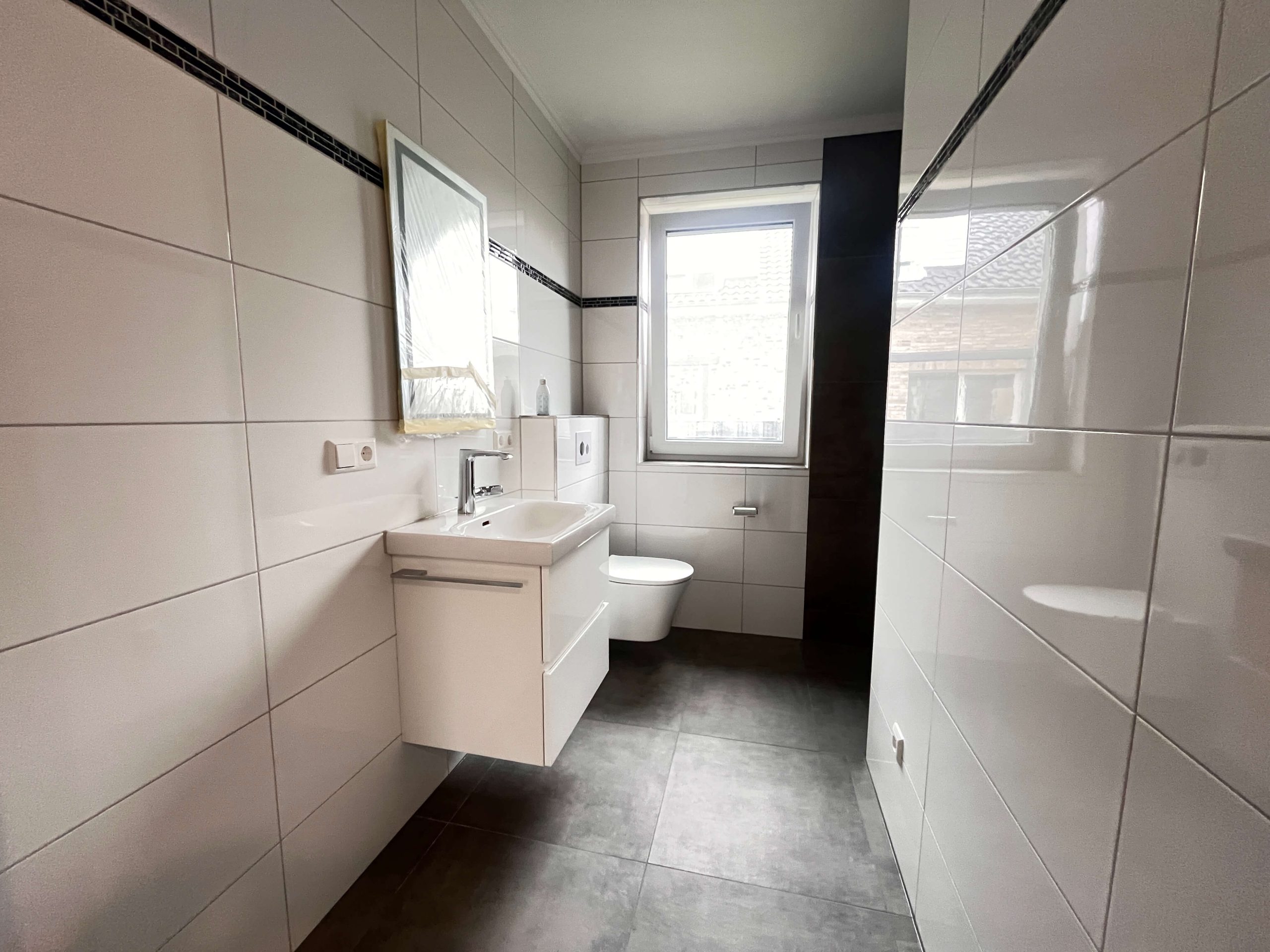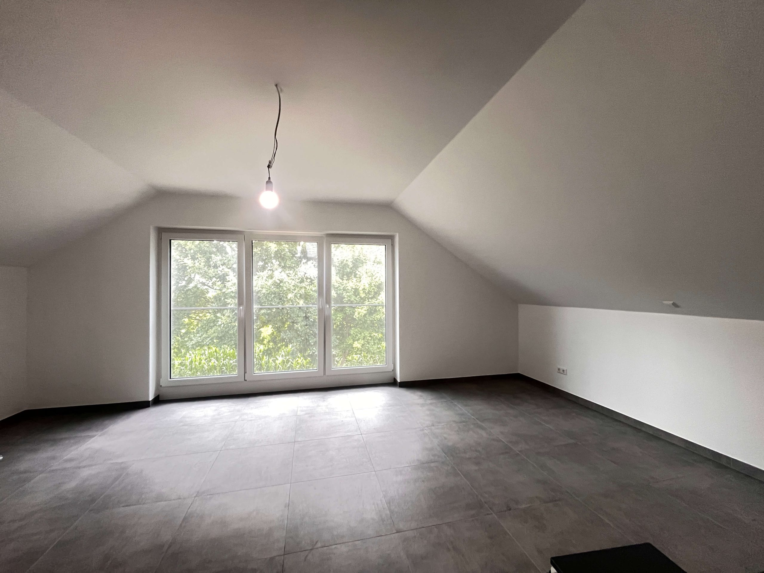 Die Bodenbeläge sind mit einheitlichen, hochwertigen Fliesen ausgestattet, die dem gesamten Wohnbereich eine klare, harmonische Linie verleihen. Besonders ins Auge fällt die geschmackvolle Treppe aus Holz, die als gestalterisches Highlight den Zugang zum Dachgeschoss bildet.