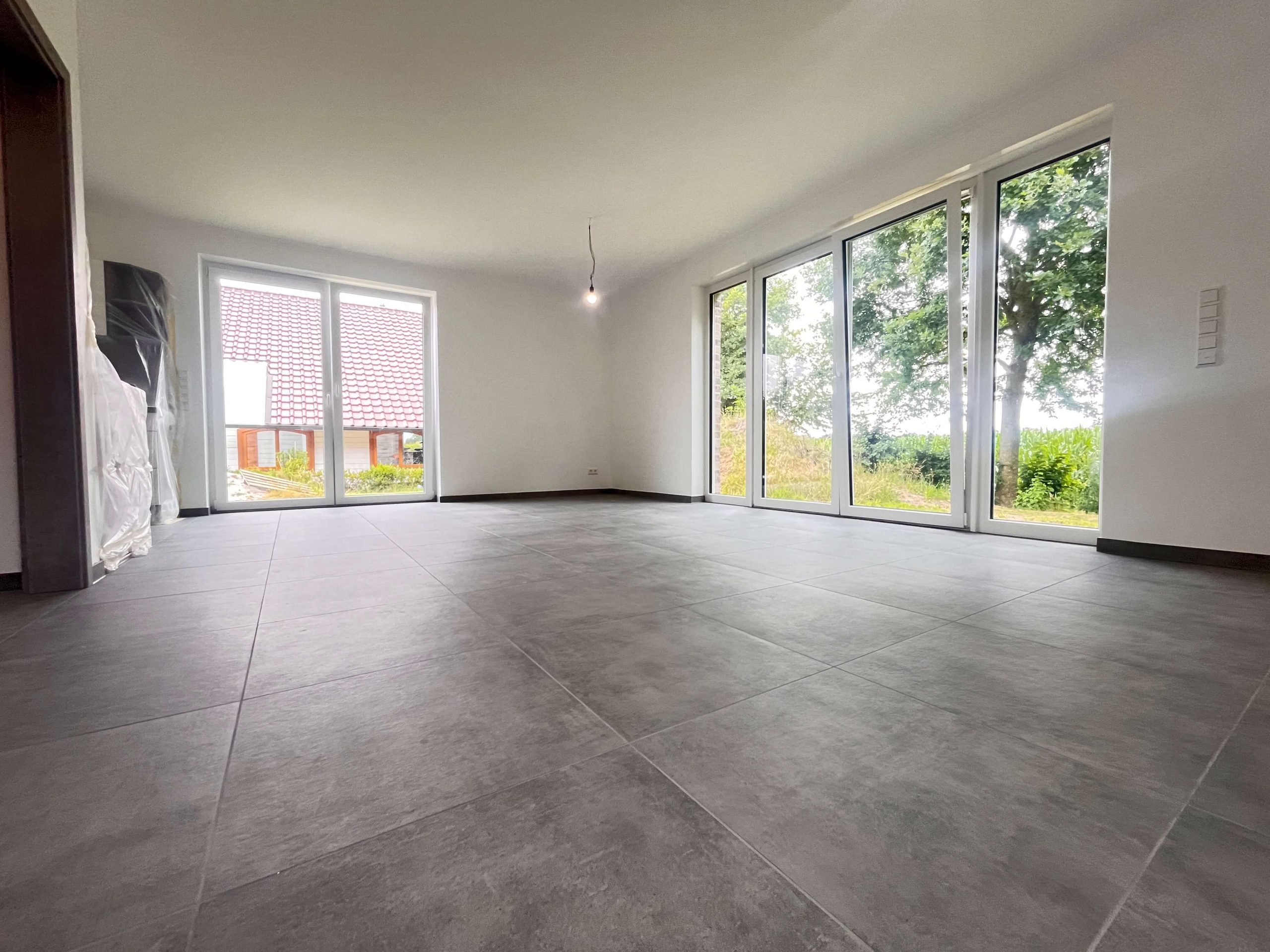 Die bodentiefen Fensterelemente im Wohnbereich sorgen für helle, lichtdurchflutete Räume und eröffnen den direkten Zugang zum Garten, der nach eigenen Wünschen und Vorstellungen gestaltet werden kann. Auch das Schlafzimmer im Dachgeschoss ist mit bodentiefen Fenstern ausgestattet und bietet einen traumhaften Ausblick in die freie Natur.