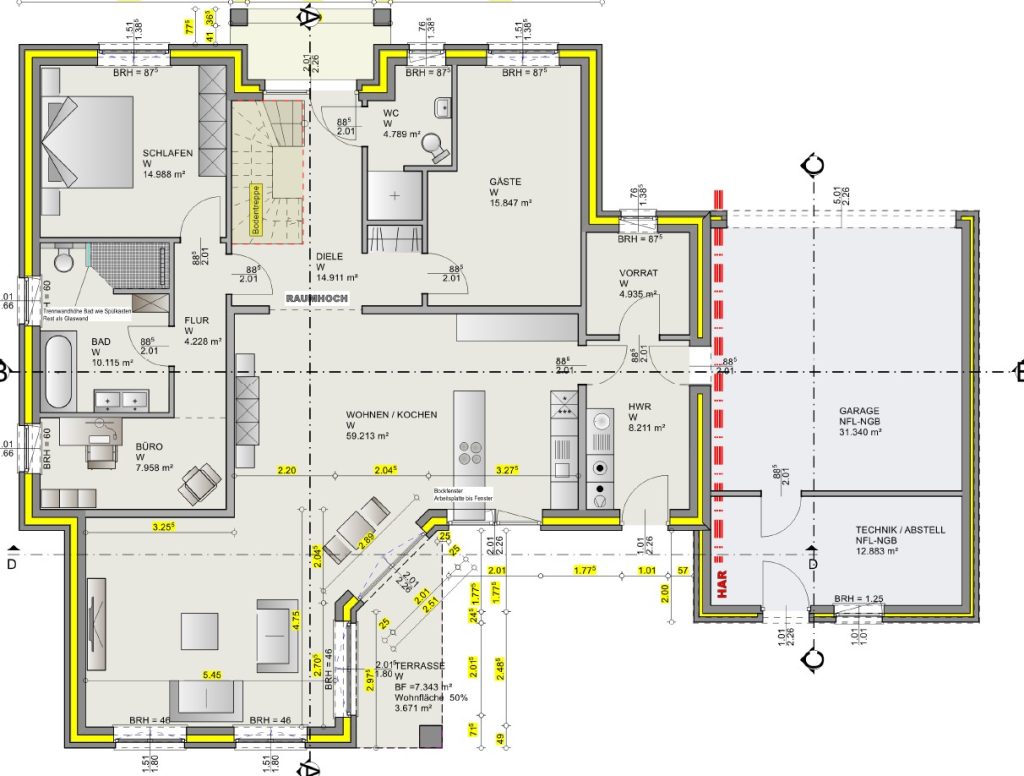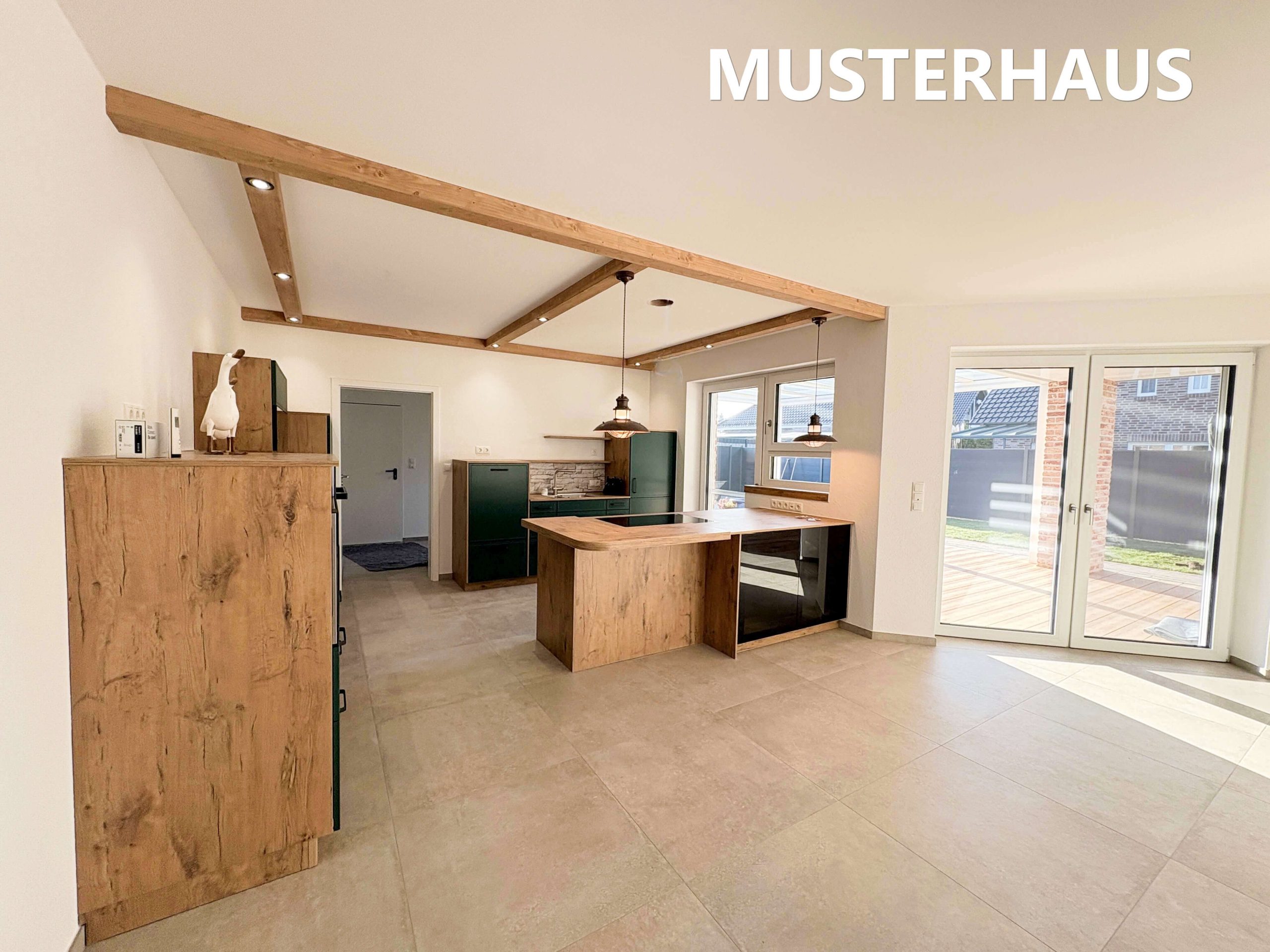 Auf einer Wohnfläche von ca. 148 m² ermöglicht das Haus komfortables ebenerdiges Wohnen mit einer klar strukturierten und zugleich großzügigen Raumaufteilung. Mittelpunkt des Hauses ist der offen gestaltete Wohn-, Ess- und Kochbereich mit ca. 59 m², der durch große Fensterflächen ein helles, freundliches Wohnambiente schafft. Kunststofffenster mit 3-fach-Verglasung sowie elektrische Rollläden unterstreichen den hochwertigen Ausstattungsstandard.