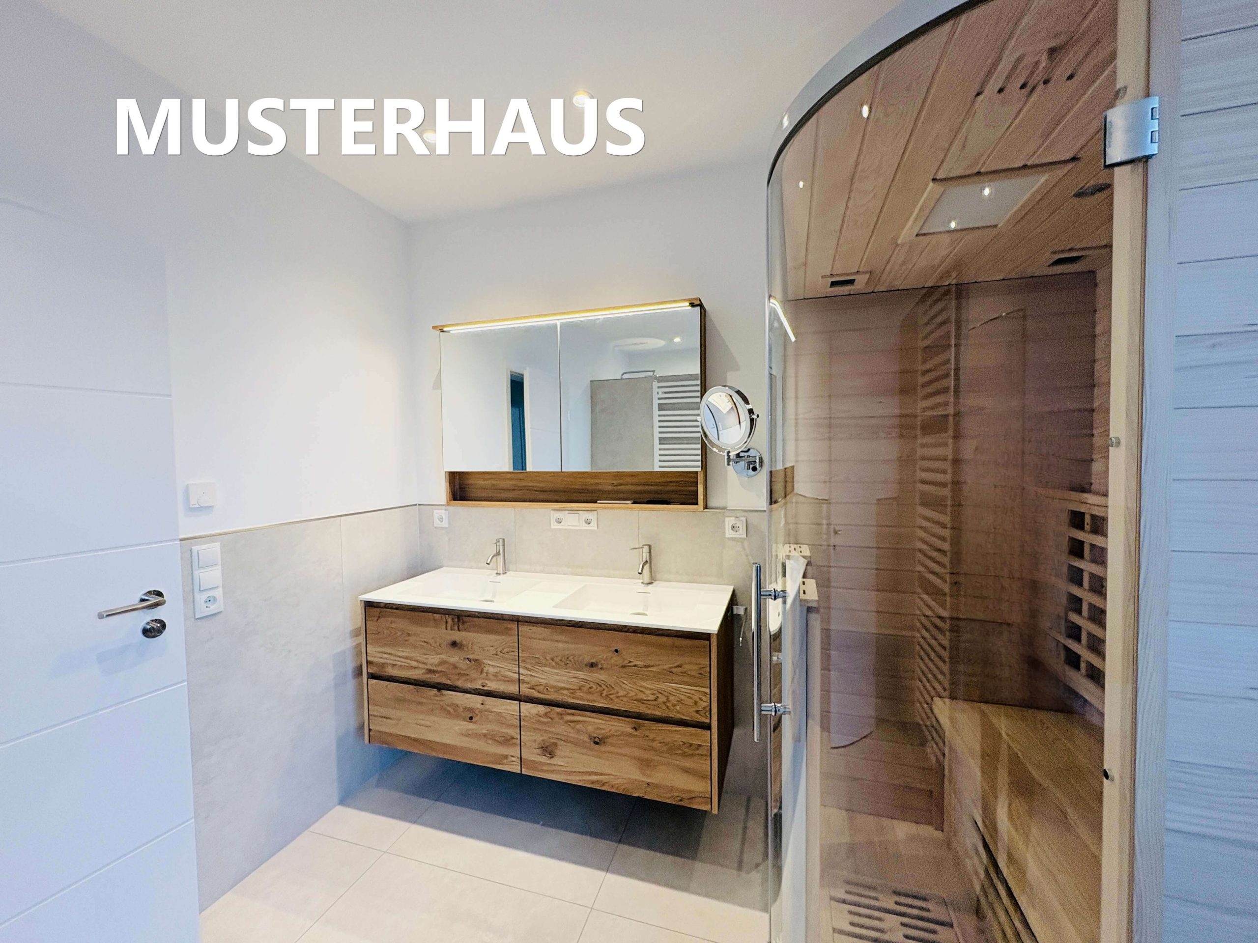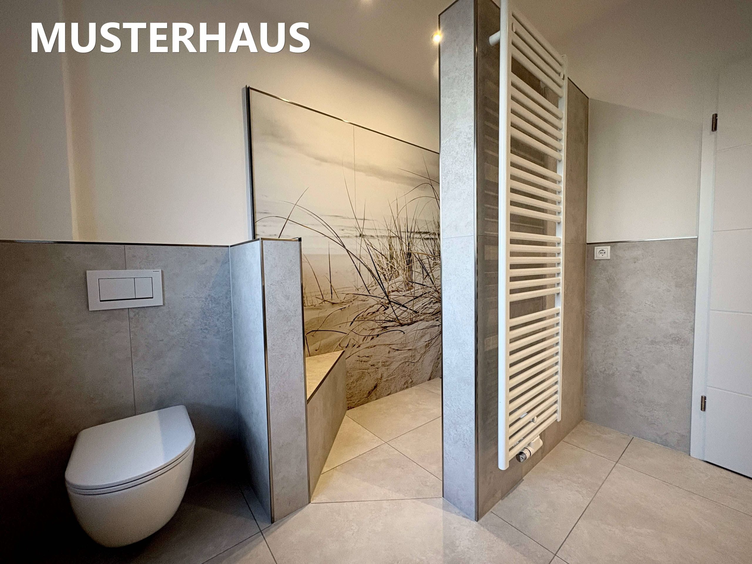 Die Beheizung erfolgt über eine moderne Luft-Wasser-Wärmepumpe in Verbindung mit Fußbodenheizung in allen Wohnräumen und gewährleistet energieeffizientes sowie behagliches Wohnen. Hochwertige Sanitärobjekte sind in allen Bereichen vorgesehen. Die Bodenbeläge werden mit großformatigen Fliesen (60 × 60 cm) ausgeführt, die Wandflächen in den Sanitärbereichen mit Wandfliesen im Format 60 × 30 cm.